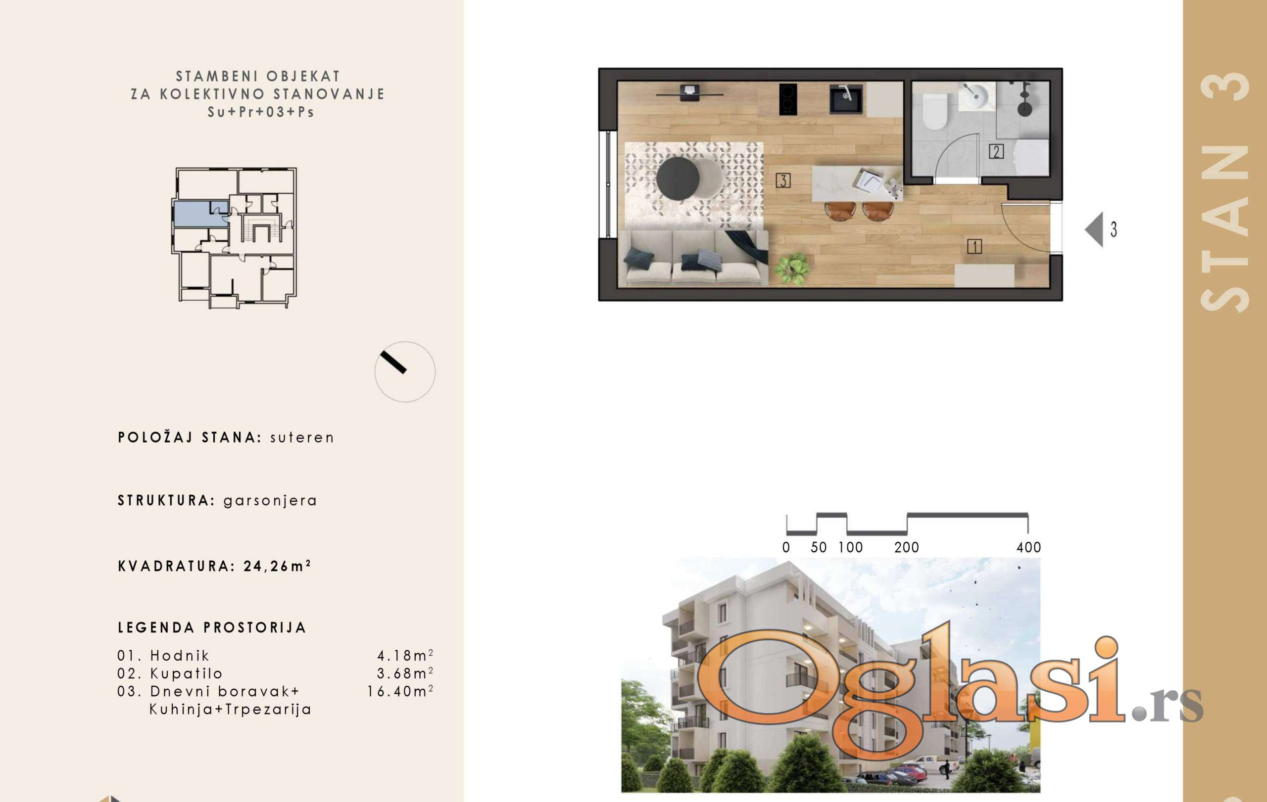 Garsonjera površine 24,26m² (plus terasa 20m² gratis), nalazi se u suterenu zgrade i prodaje se po ceni od 1450e/m², što je ukupno 35.177 evra.