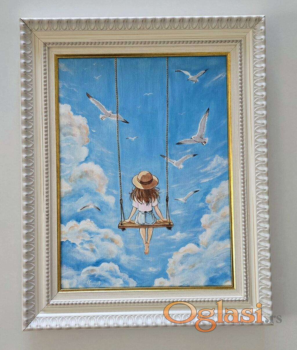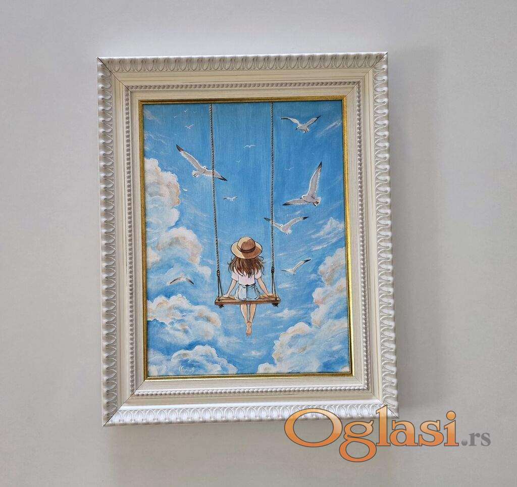 Slika Sloboda u oblacima, tehnika akril na platnu. Prelepo umetnicko delo. Slika je uramljena u jako lep ram, dimenzije slike sa ramom 53 x 43. Privatna kolekcija.
