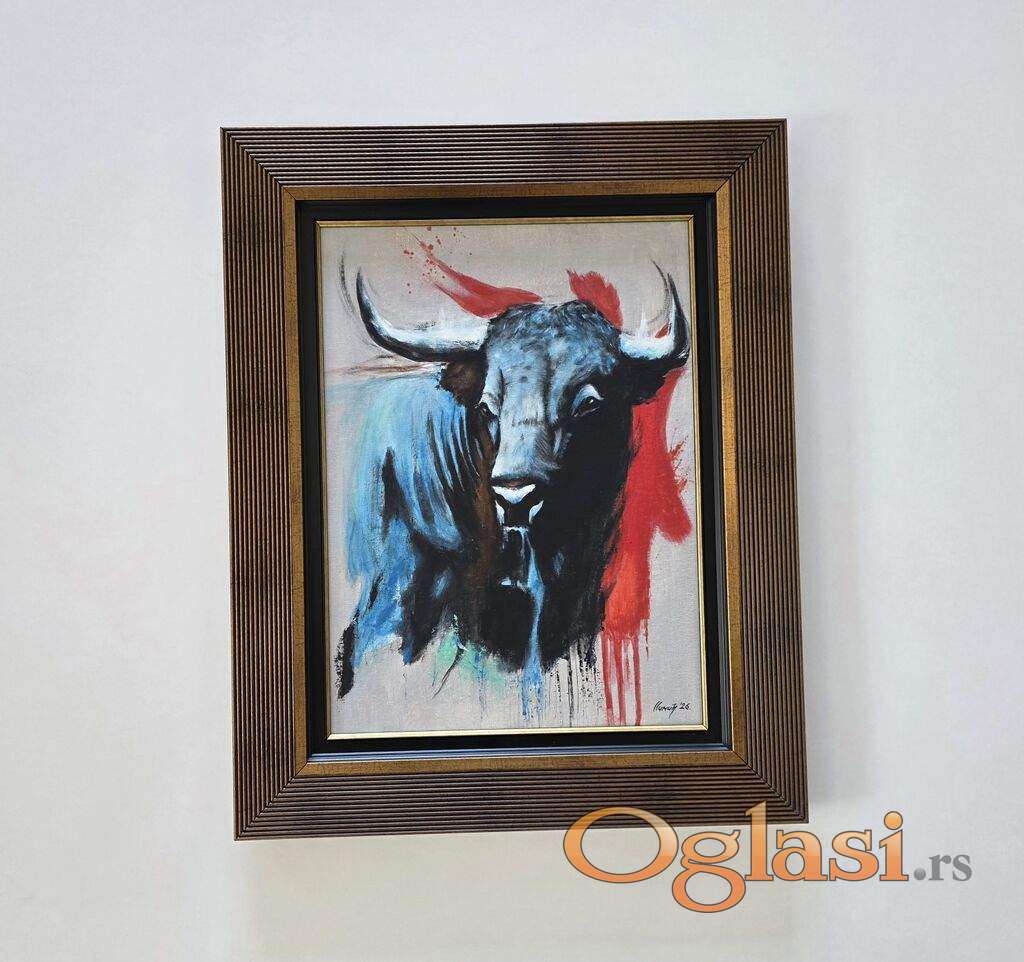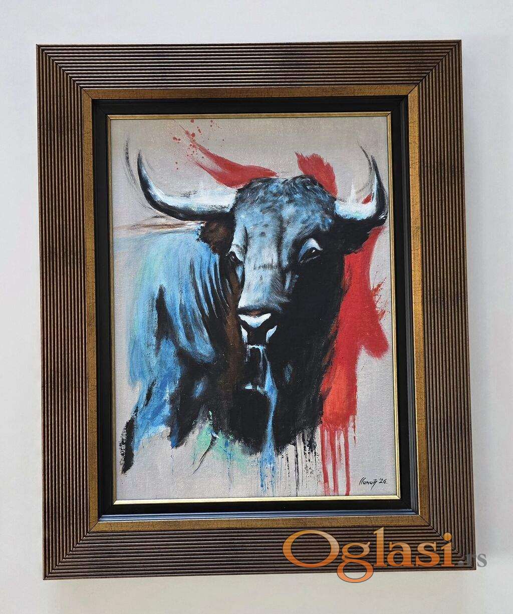 Slika Bik, tehnika akril na platnu. Prelepo umetnicko delo. Slika je uramljena u jako lep ram, dimenzije slike sa ramom 54 x 44. Privatna kolekcija.