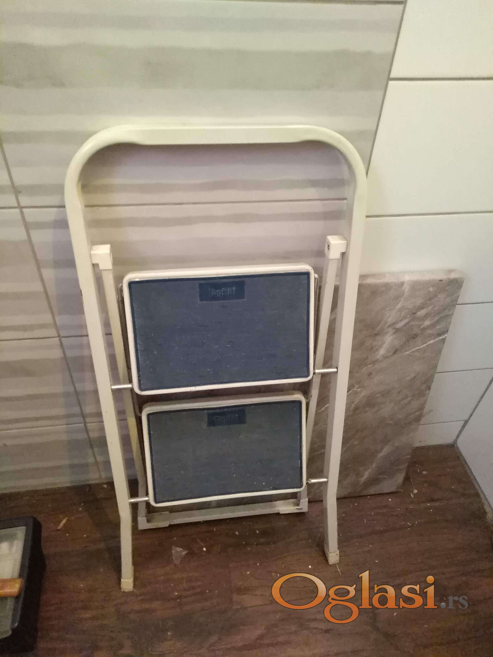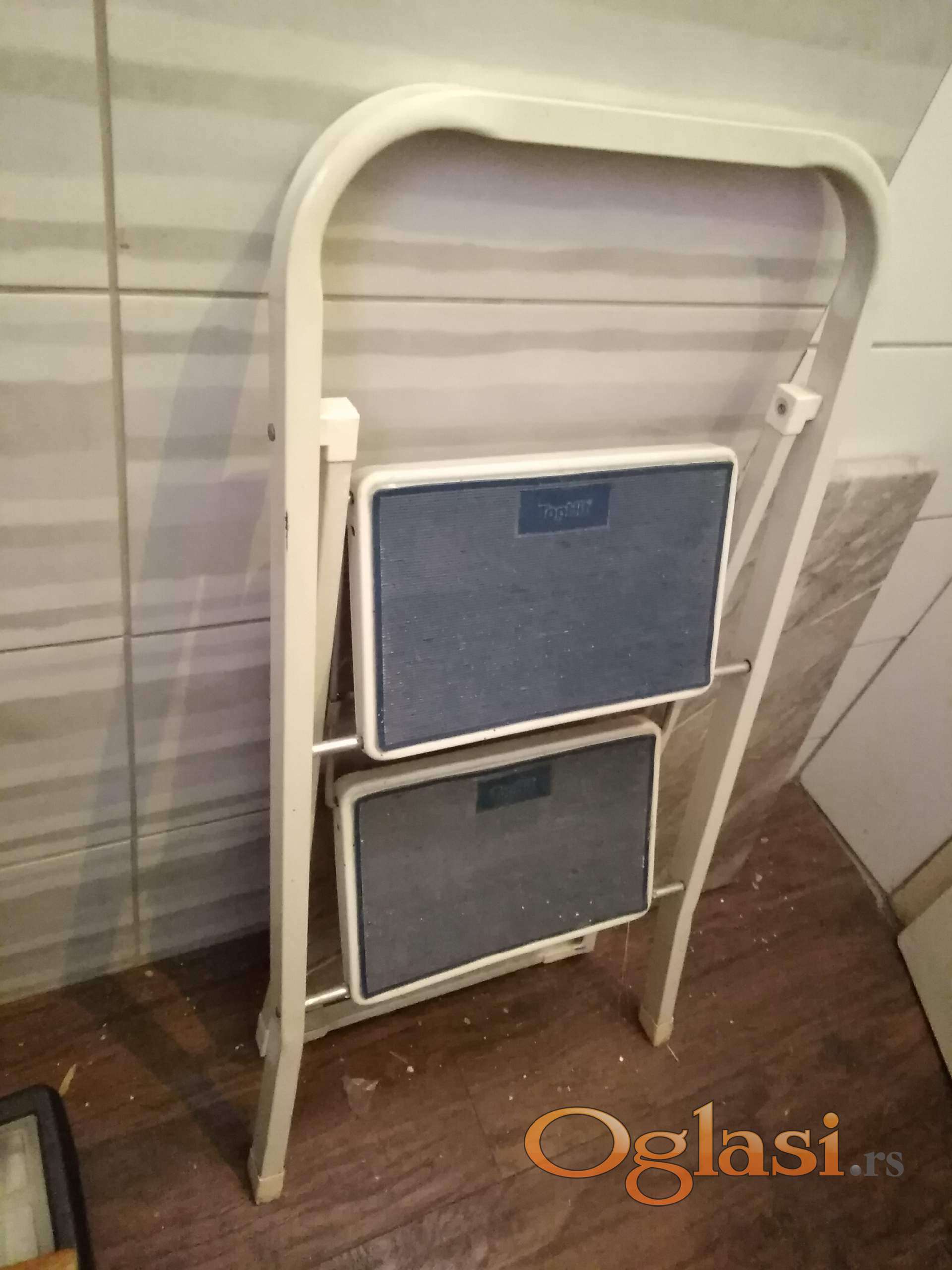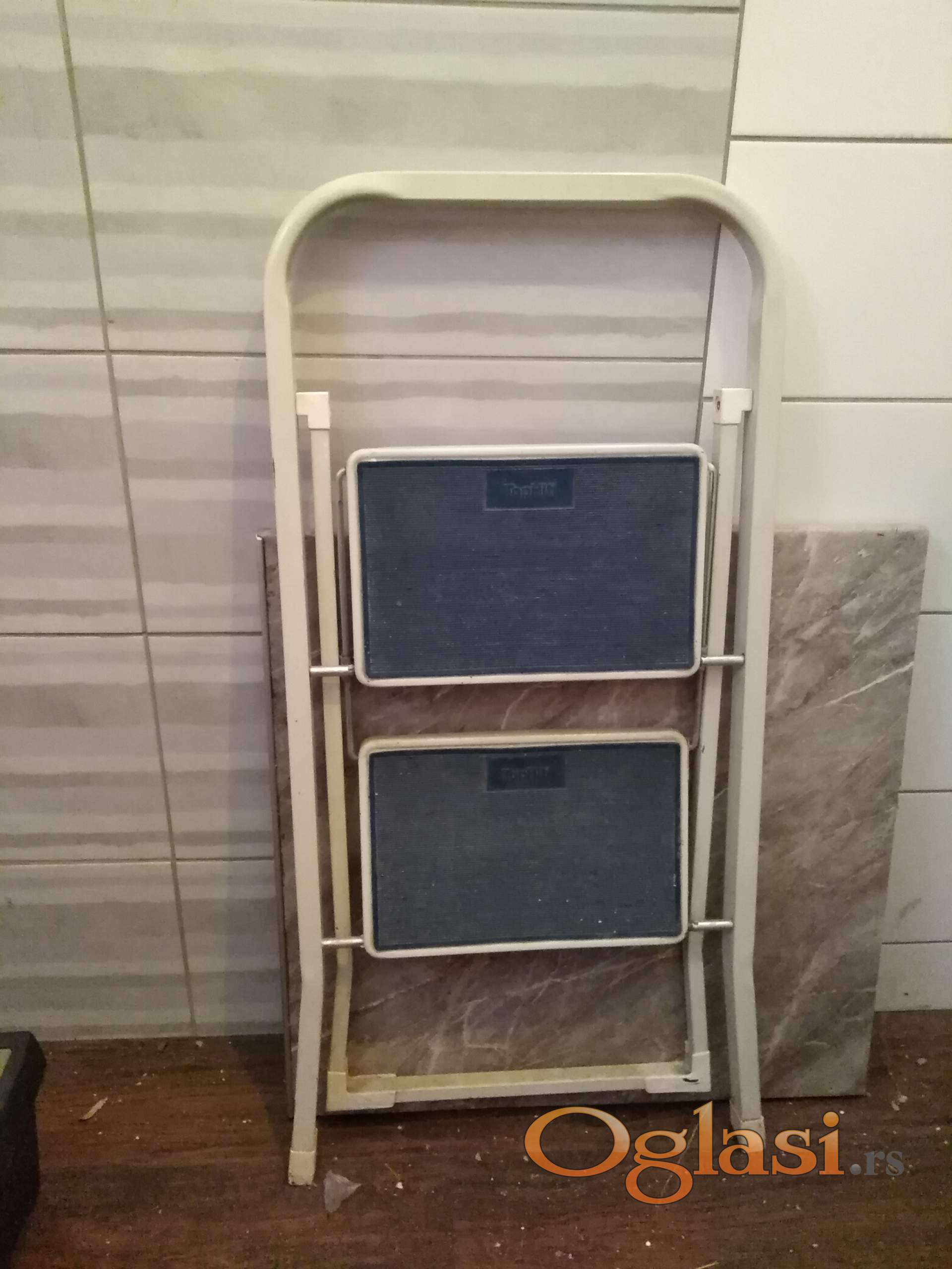 tophit aluminijumske merdevine sa 2 gazišta . ekstra očuvane , kao nove . ukupna visina 90 cm , gornje gazište je na 50 cm . nosinost 150 kg .