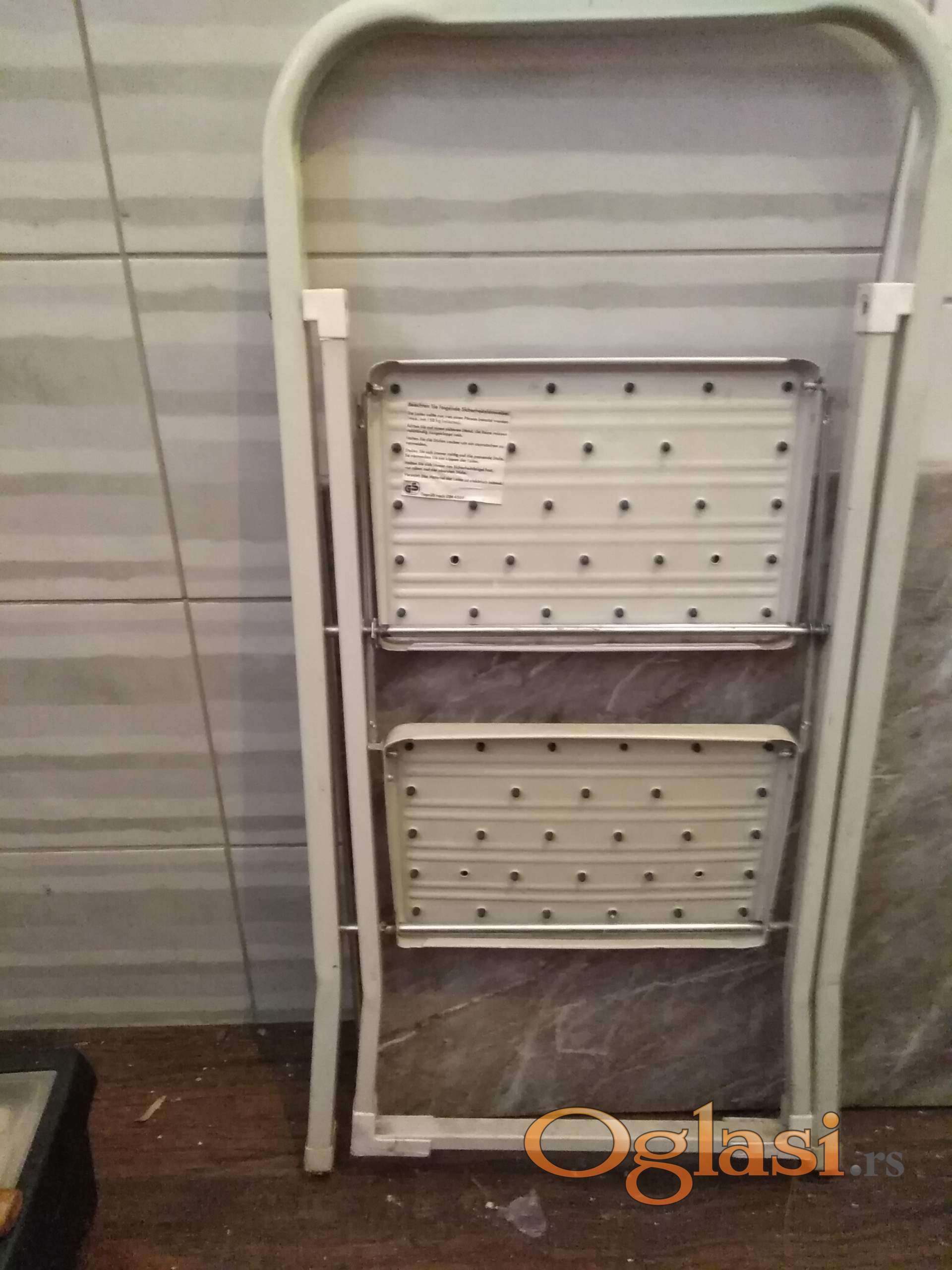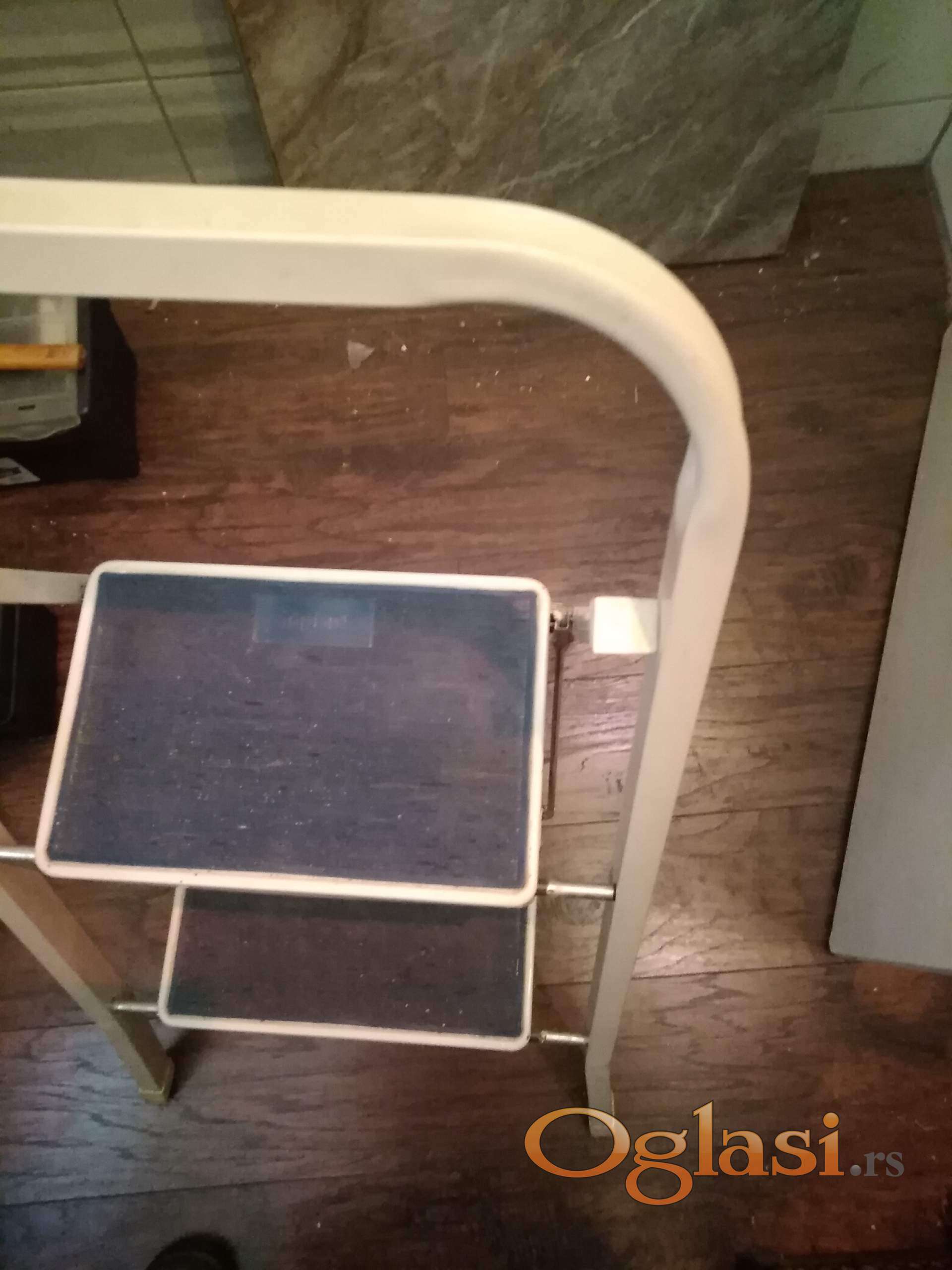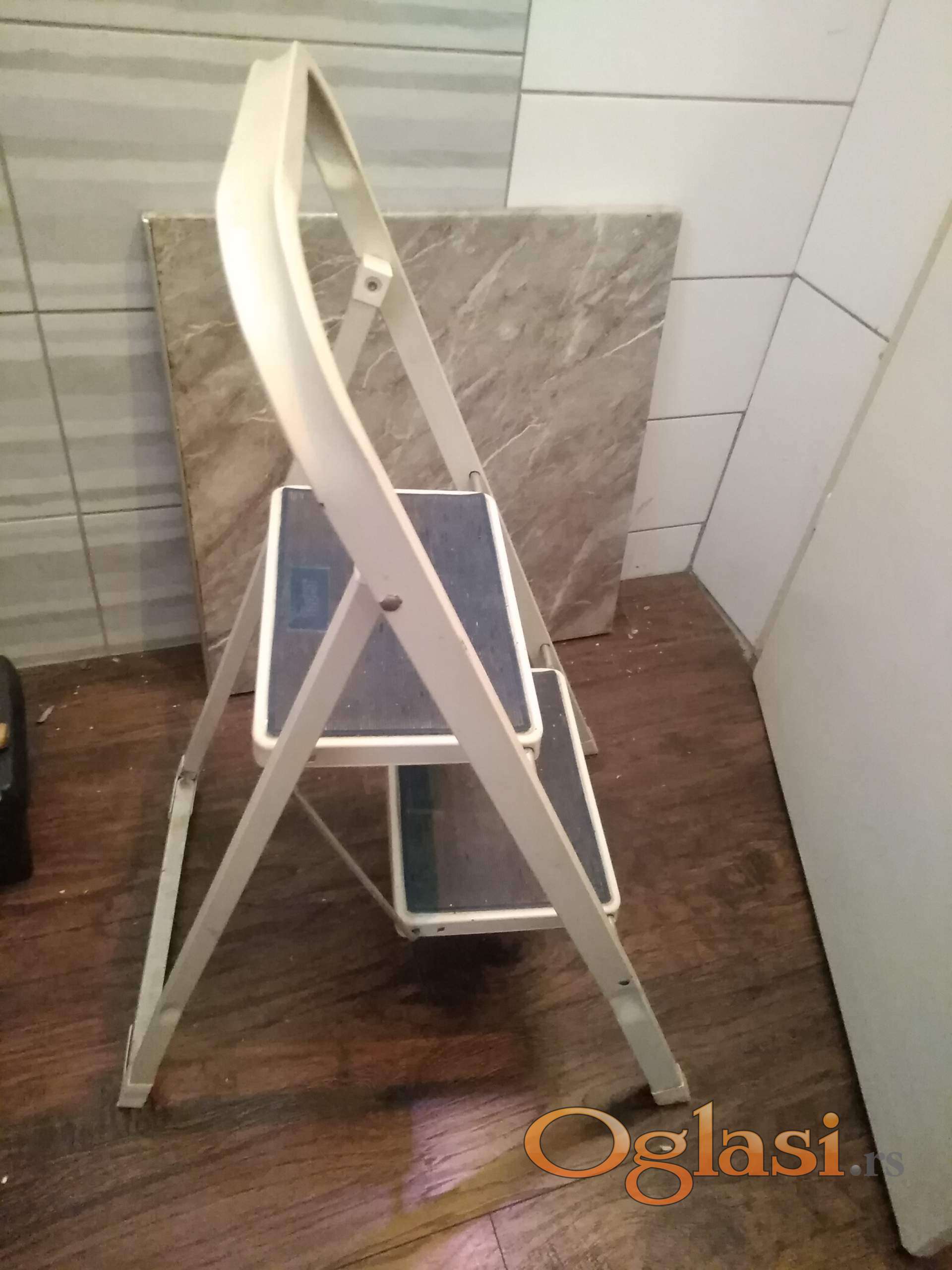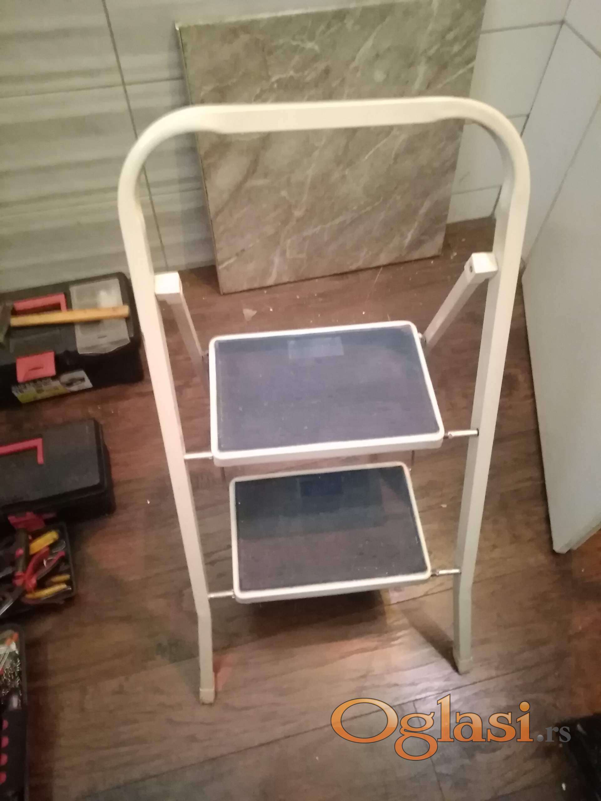 tophit aluminijumske merdevine sa 2 gazišta . ekstra očuvane , kao nove . ukupna visina 90 cm , gornje gazište je na 50 cm . nosinost 150 kg .