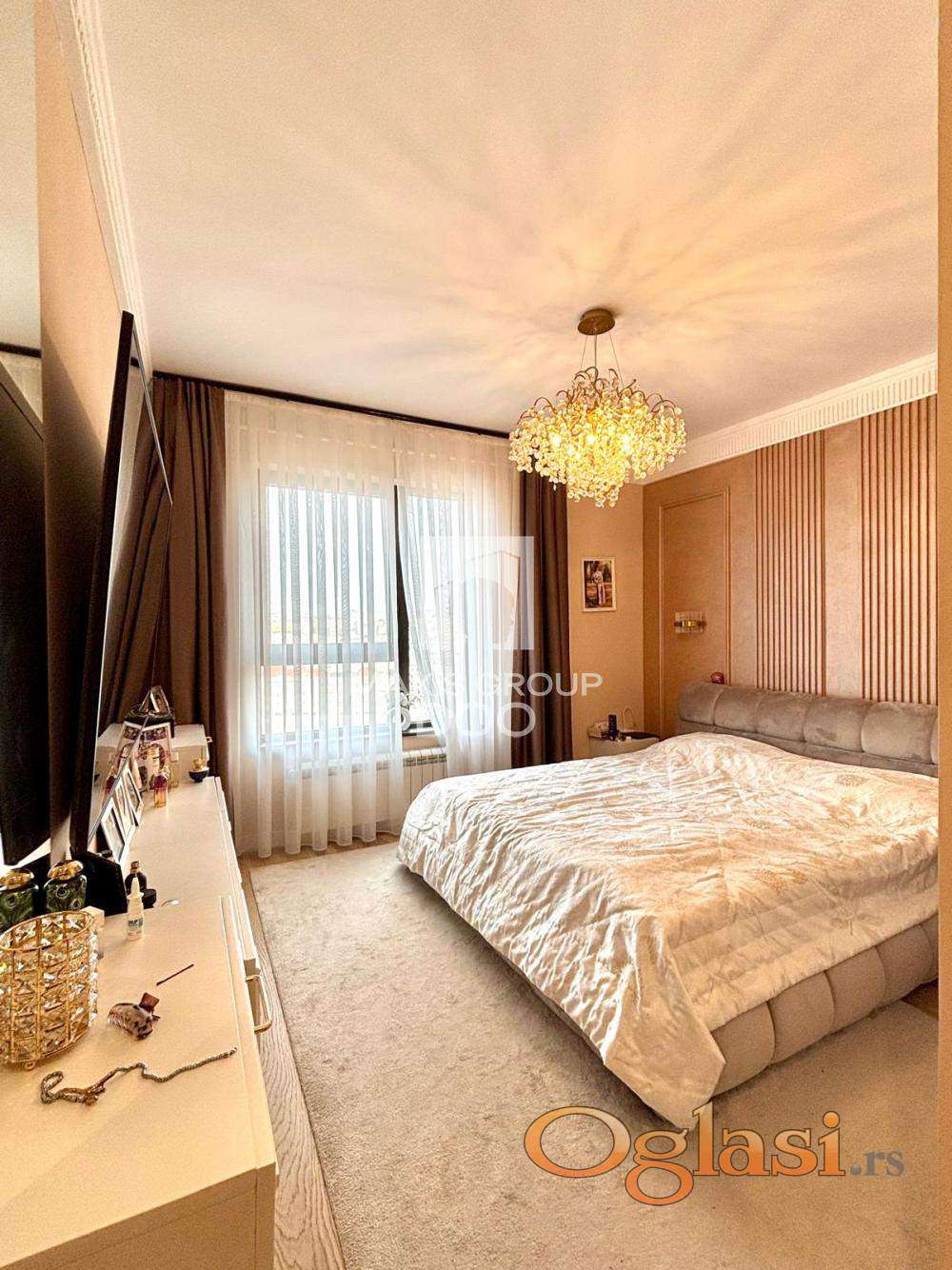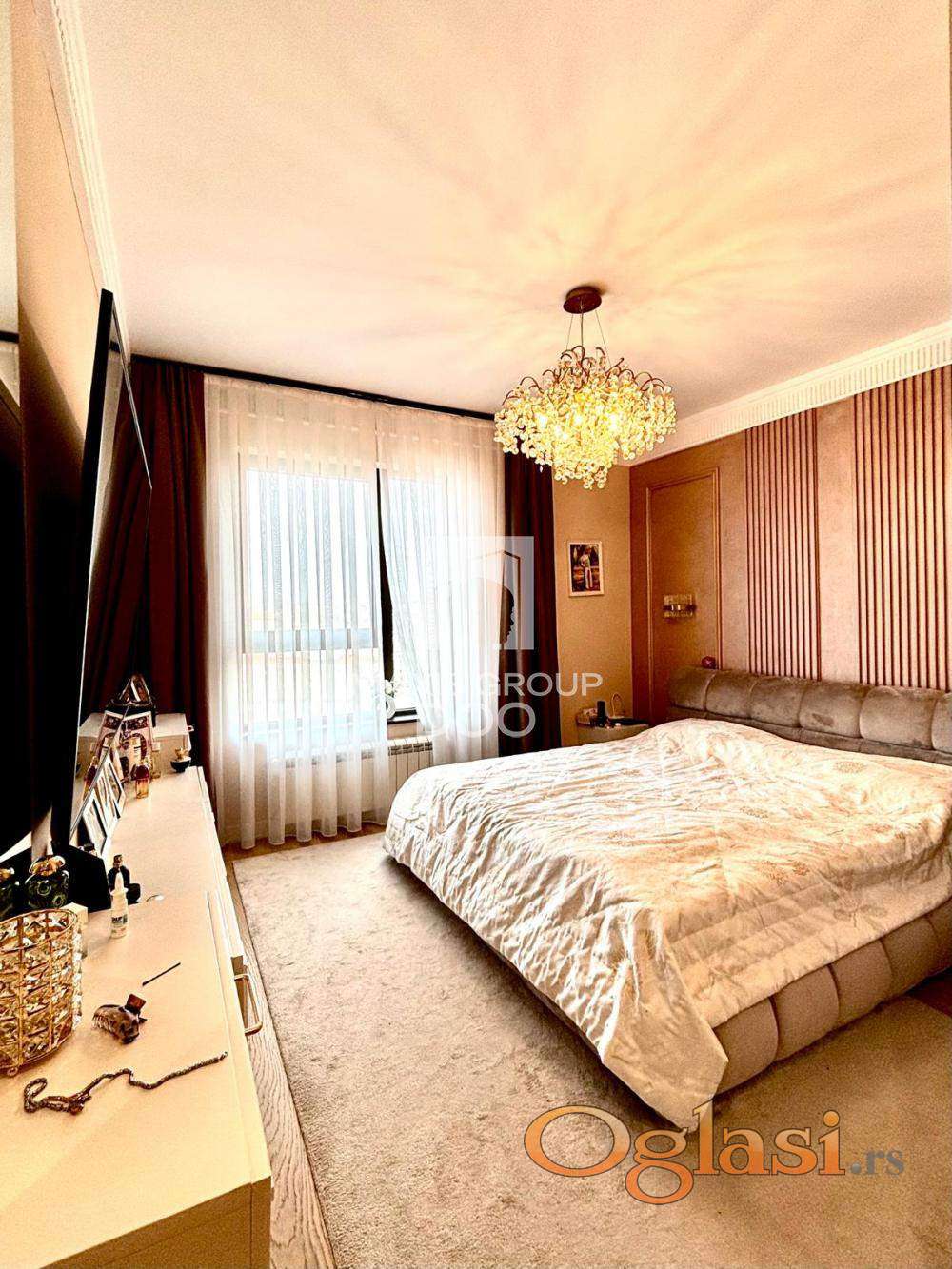 Stan je kompletno opremljen kvalitetnim nameštajem i modernom tehnikom, pažljivo biranom kako bi se postigao sofisticiran i topao ambijent. Svaki detalj enterijera doprinosi osećaju elegancije i udobnosti, što ovu nekretninu čini idealnim izborom kako za porodični život, tako i za investiciju visoke klase.