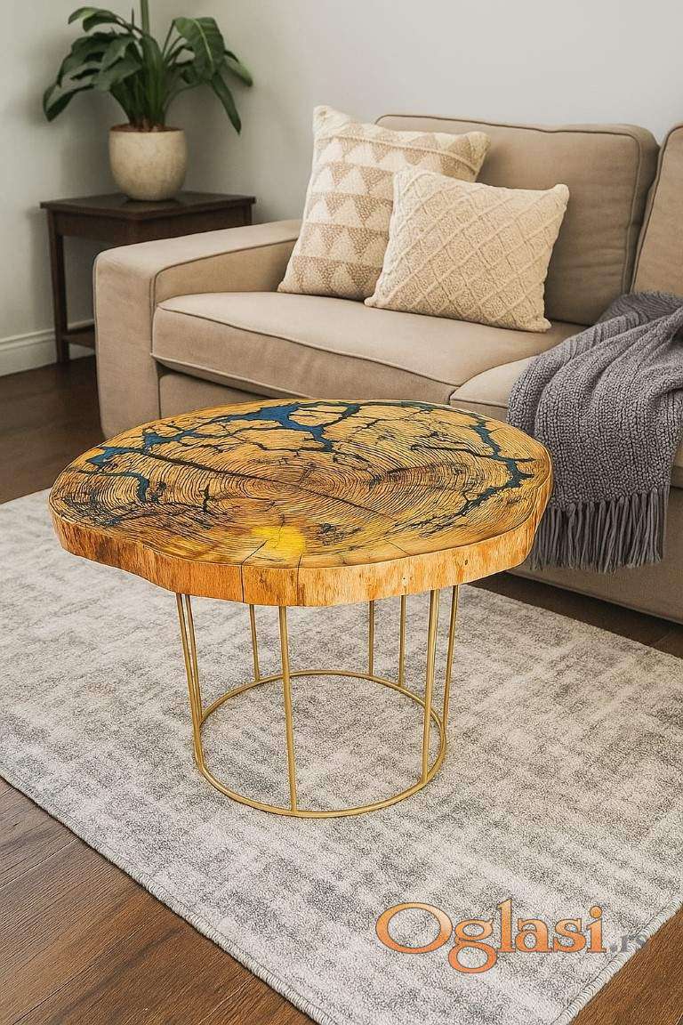 Klub sto napravljen od drveta jasena sa epoxydnom smolom i pozlaćenim metalnim nogama.