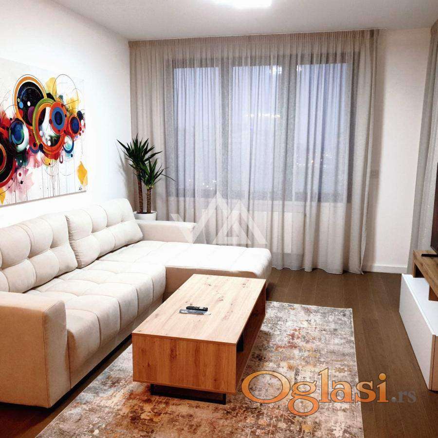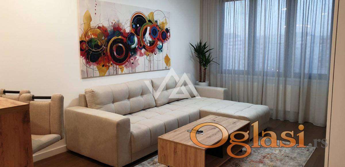 U ponudi je potpuno nov i moderno opremljen stan** površine 51m2, smešten na 8. spratu savremene novogradnje u atraktivnom delu Novog Beograda – kompleks Lastavice (Blok 58).