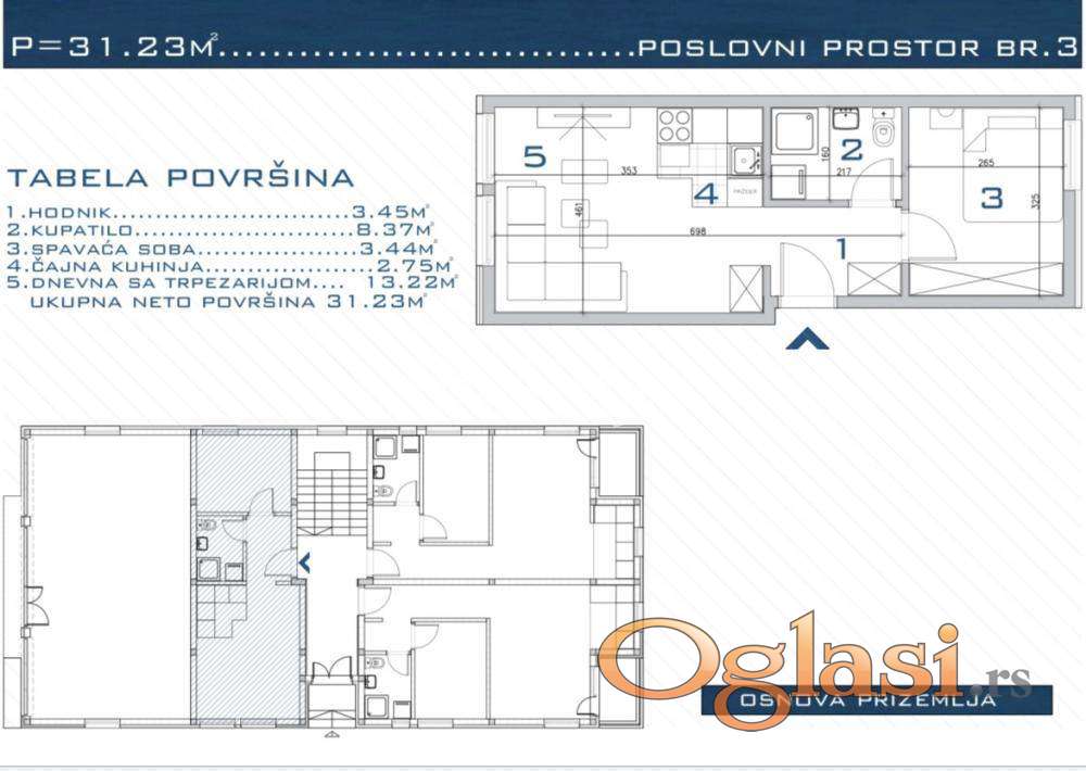 Prikazani stan je u prizemlju i vodi se kao poslovni prostor. Sastoji se od: ulaznog hodnika, spavaće sobe, kupatila, dnevnog boravka sa trpezarijom, cajne kuhinje.