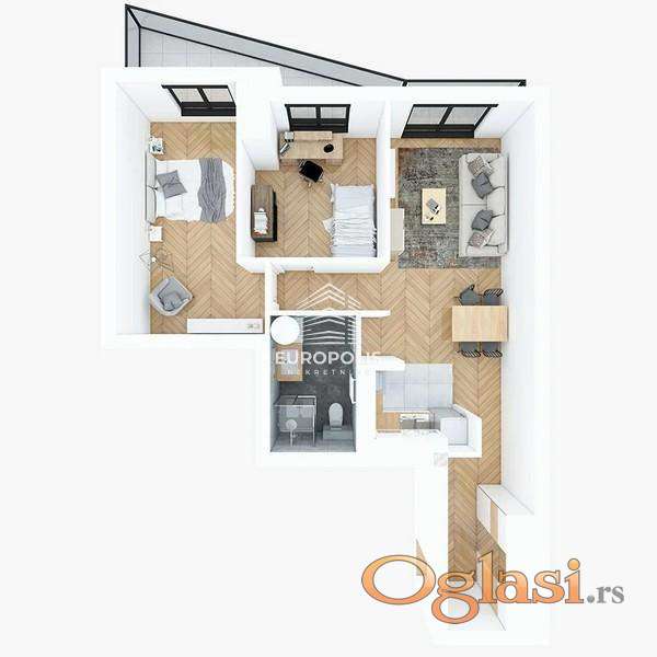 Struktura: 2.5 soban (dnevni boravak sa kuhinjom + dve spavaće sobe)