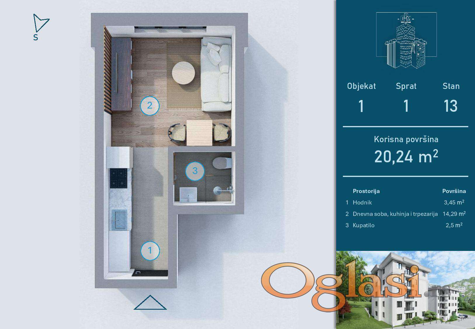 Izdvajamo iz ponude garsonjeru na prvom spratu, površine 20,24m², po ceni od 1.850 €/m² + 10 %PDV, što je ukupno 37.444 € + 10 %PDV.