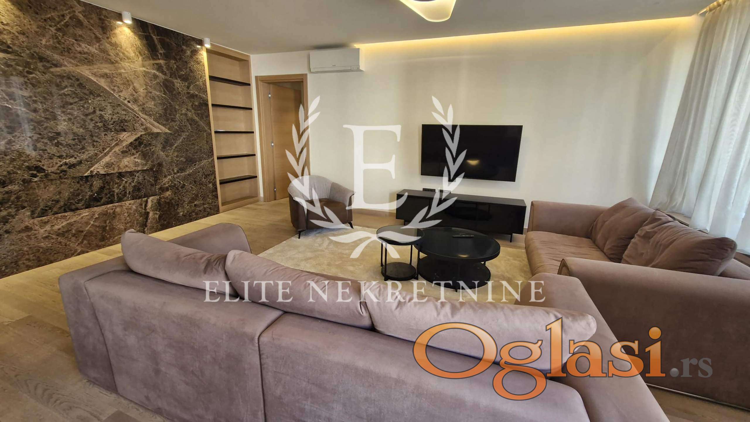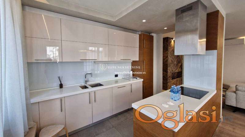 Izuzetnog kvaliteta završnih radova i opreme, dnevna soba, trpezarija i kuhinja čine otvoren prostor koji ima izlaz na terasu. Kuhinja je kompletno opremljena.