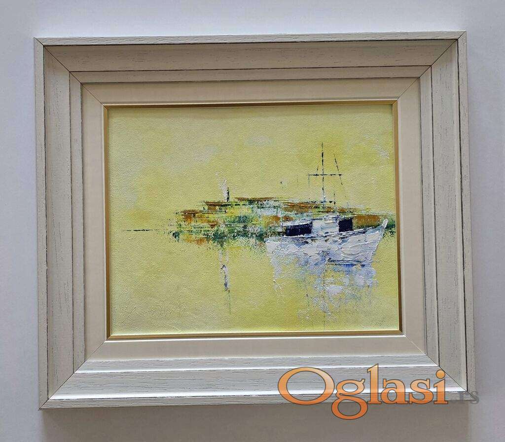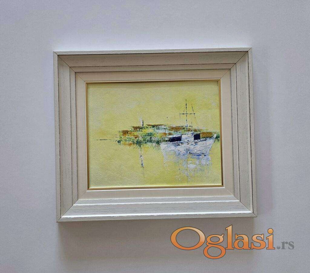 Ulje na platnu Zlatan sumrak na vodi, prelepo umetnicko delo. Slika je uramljena u jako lep ram, dimenzije slike sa ramom 45 x 38. Privatna kolekcija.