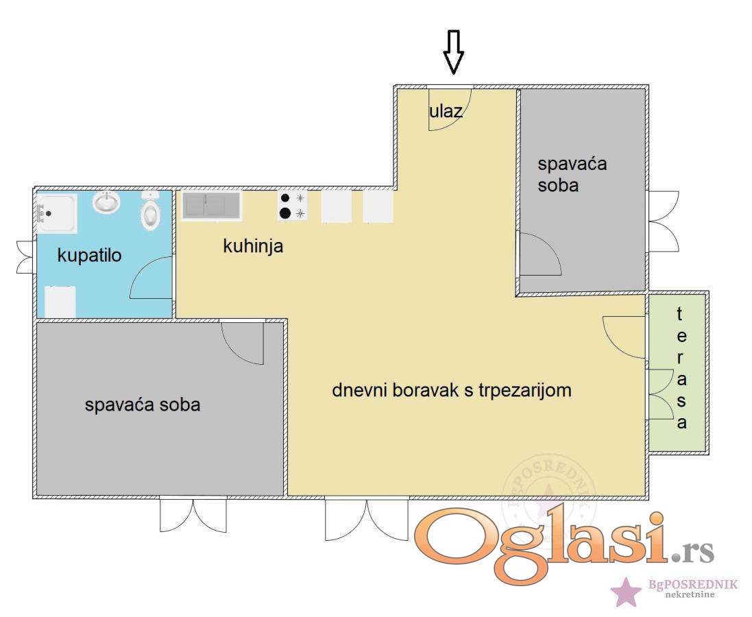 Prostorije: hodnik, dnevno-trpezarijski deo sa kuhinjom, dve spavaće sobe, kupatilo i terasa.