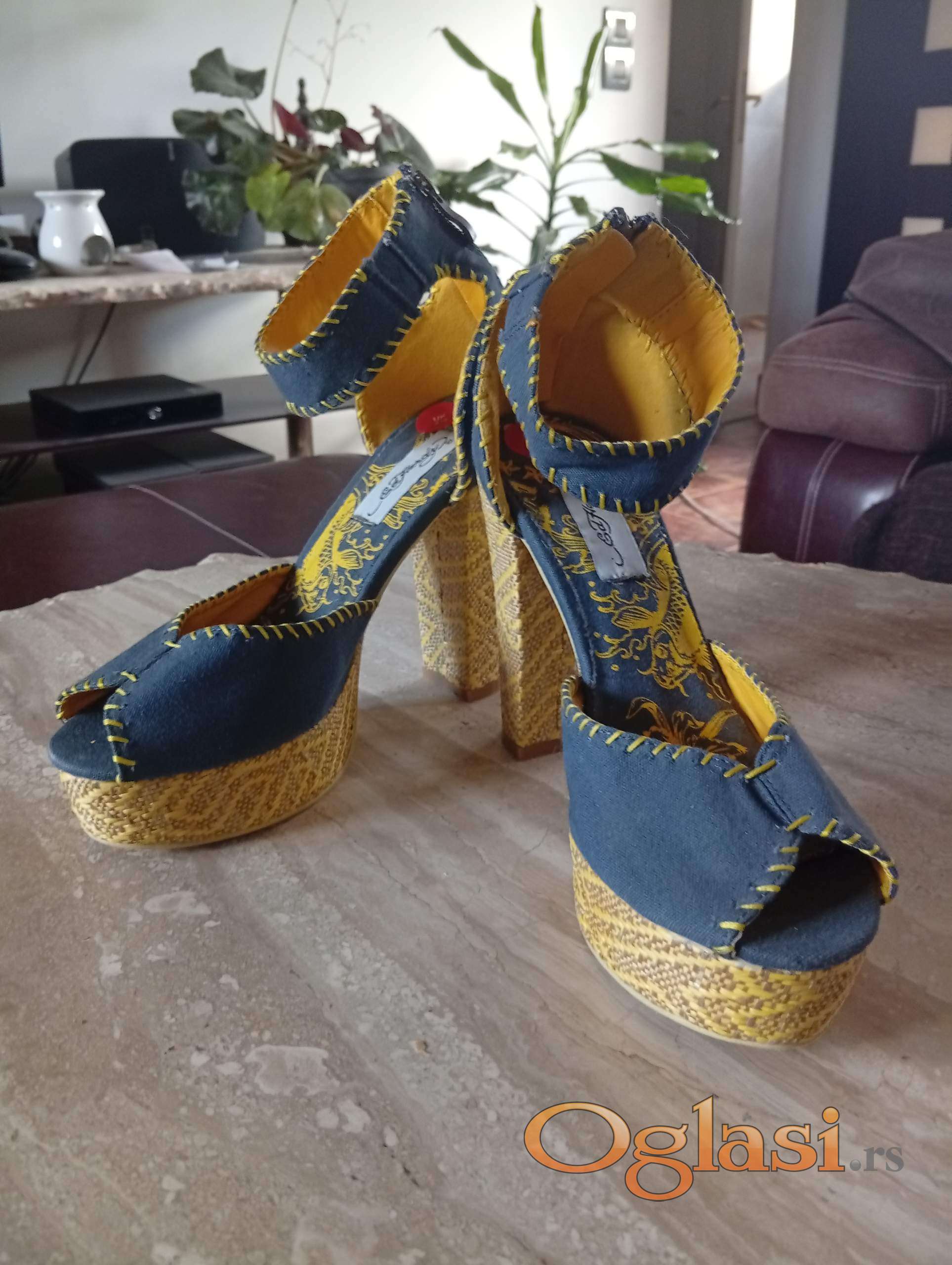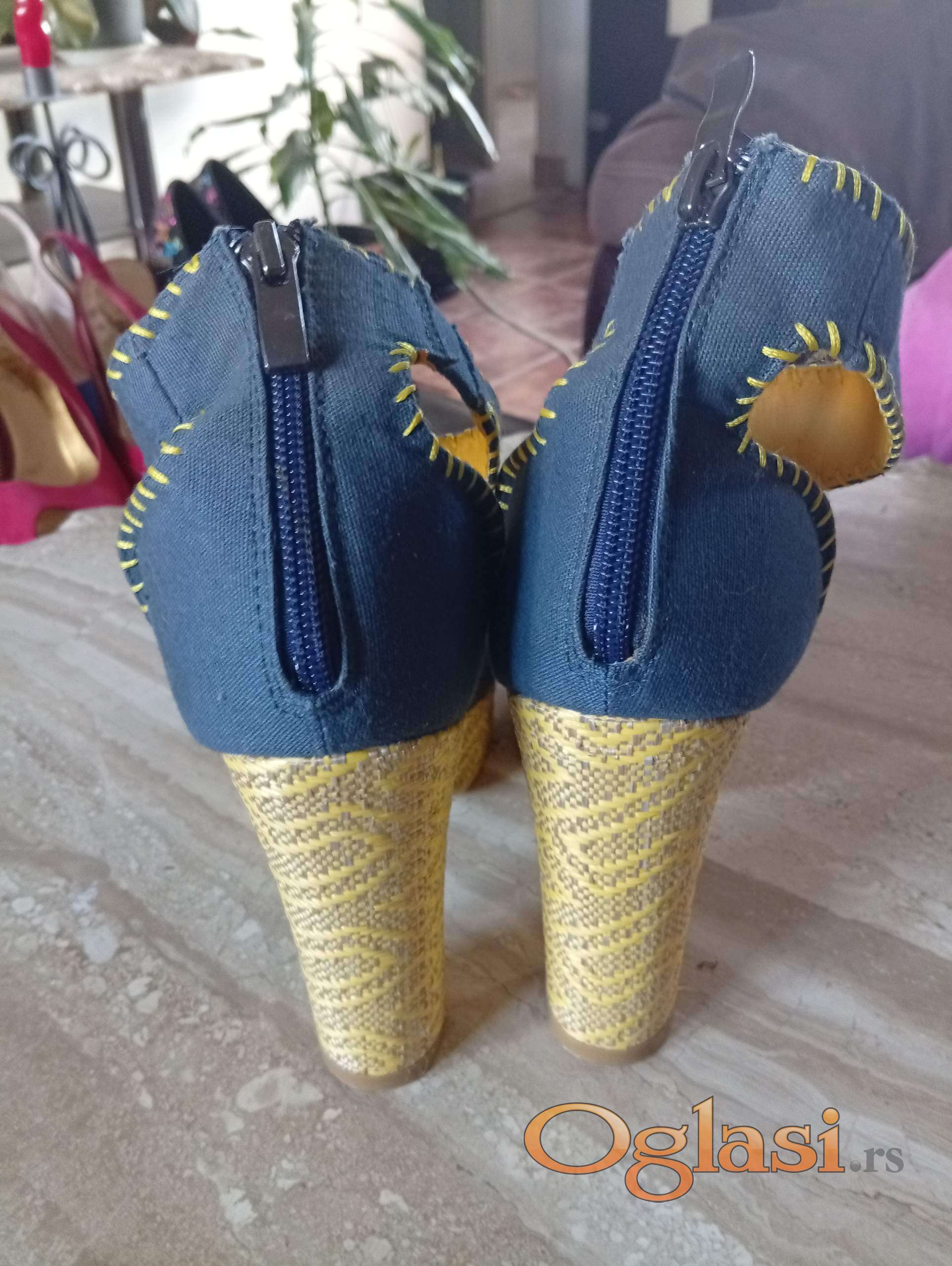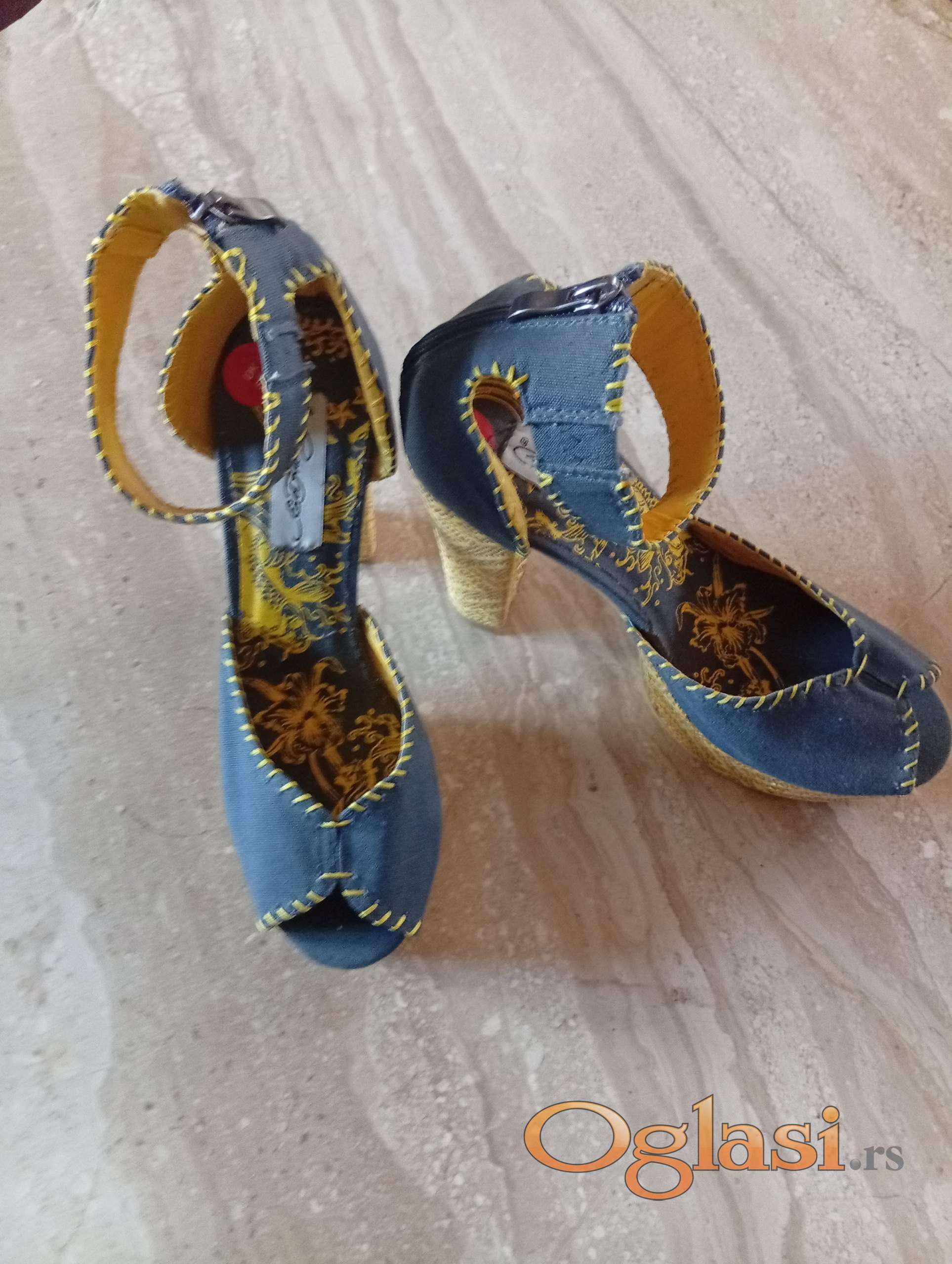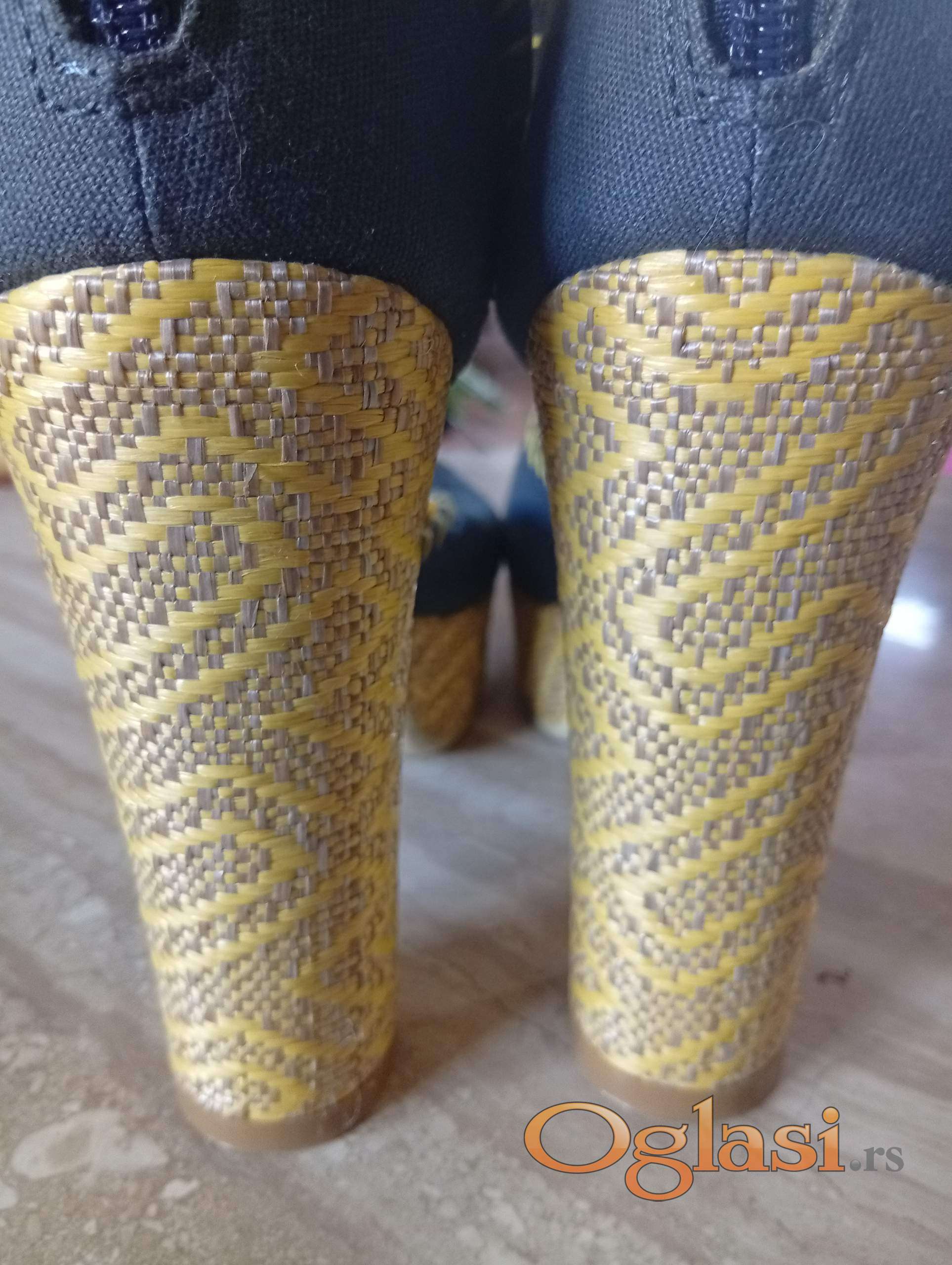 Autentičan dizajn sa prepoznatljivim vezom i printom na štikli. Teget tekstil, zlatno-zuti bogat vez i print na stikli, rucno siveni detalji.