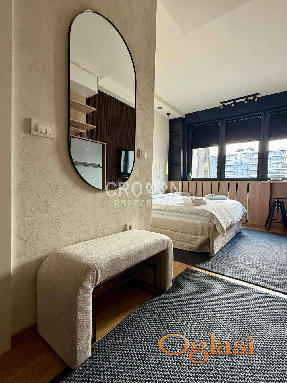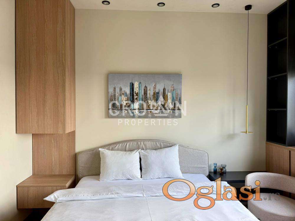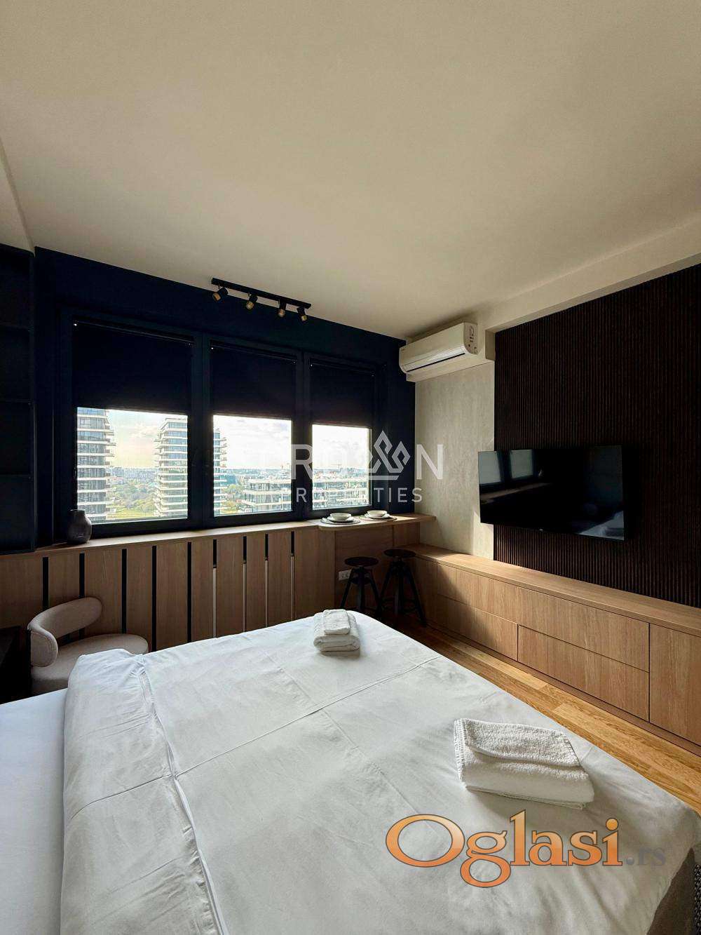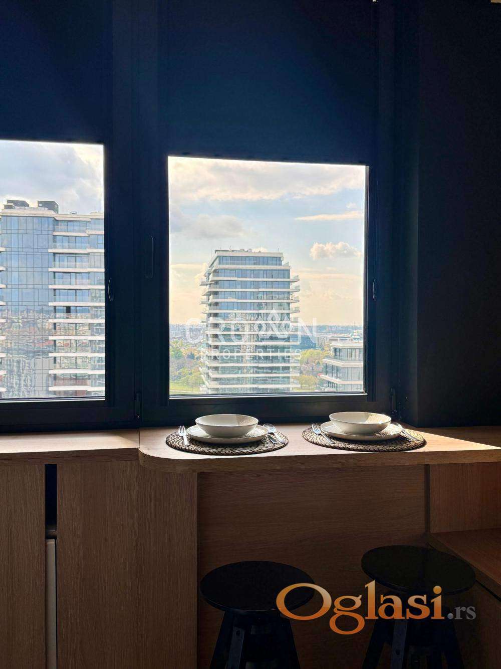 Izdaje se ekskluzivan studio stan u prestižnom kompleksu Beograd na vodi, na visokom spratu sa spektakularnim pogledom na reku. Stan je moderno uređen, potpuno opremljen i spreman za useljenje.