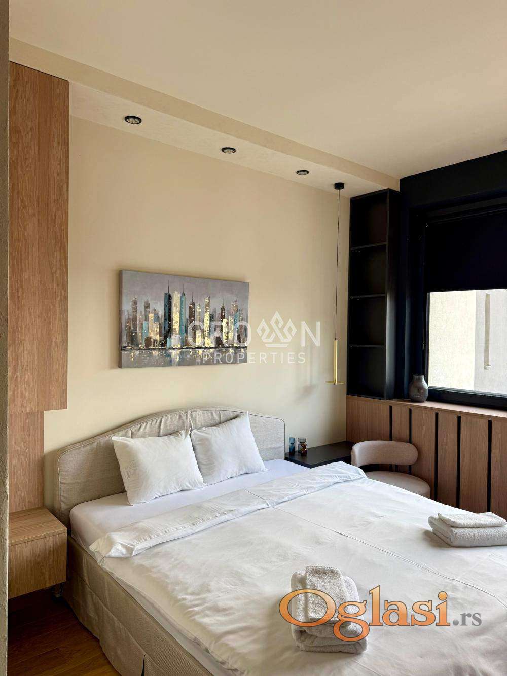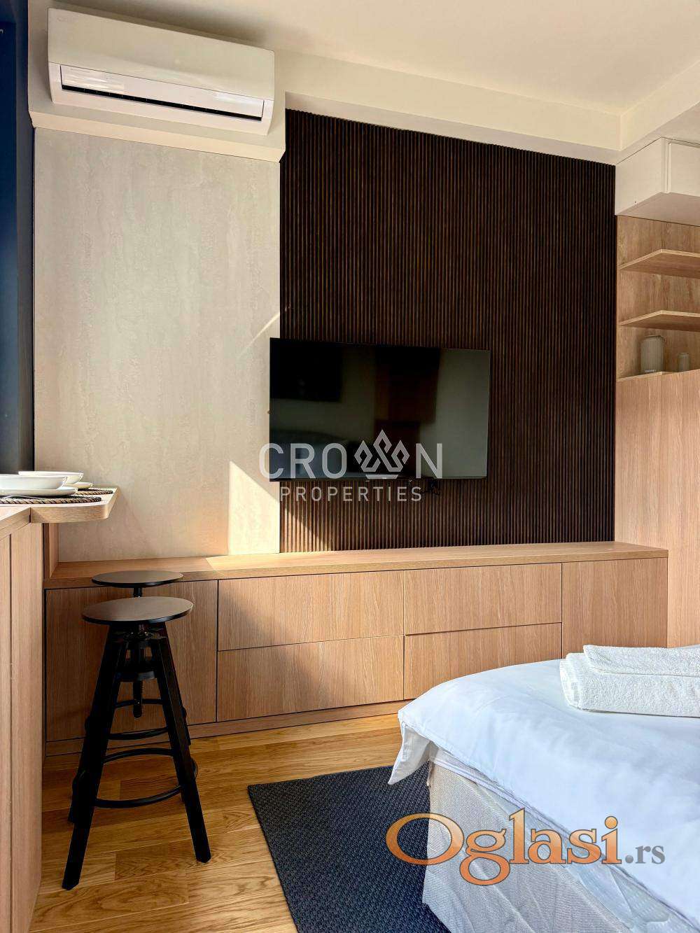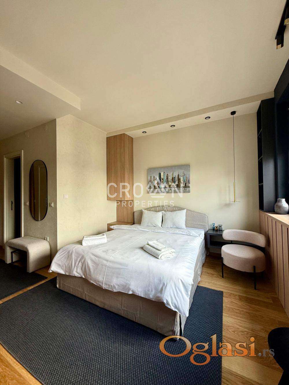 Izdaje se ekskluzivan studio stan u prestižnom kompleksu Beograd na vodi, na visokom spratu sa spektakularnim pogledom na reku. Stan je moderno uređen, potpuno opremljen i spreman za useljenje.