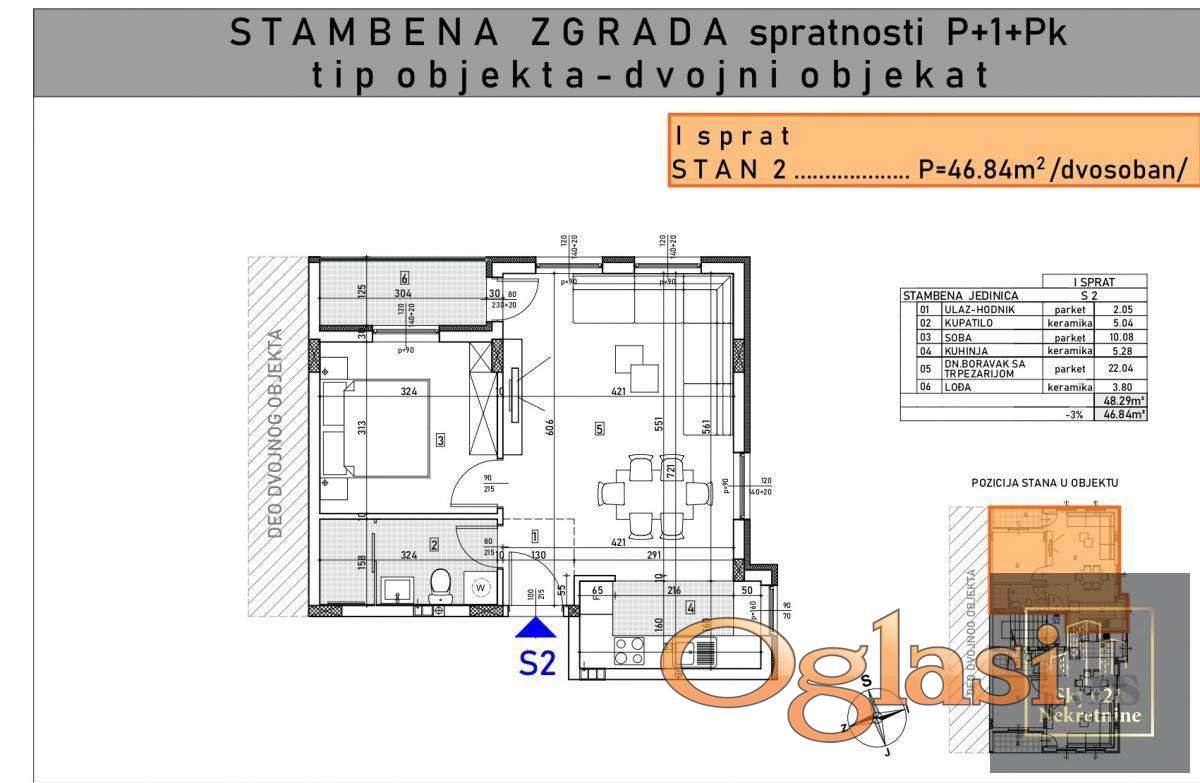 Stan površine 47 m² nalazi se na prvom spratu i odlikuje ga izuzetno dobro osmišljen raspored, maksimalno iskorišćen prostor i obilje prirodne svetlosti koje doprinosi osećaju prostranosti i prijatnog boravka tokom celog dana.