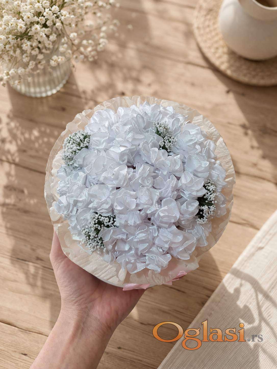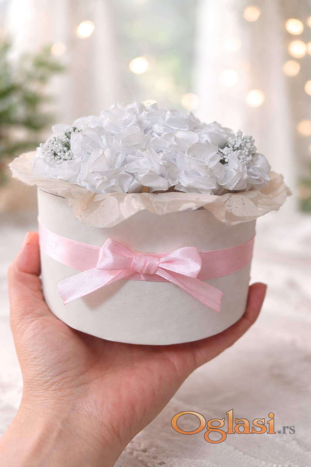 Nežan i elegantan dekorativni aranžman napravljen od satenskih cvetova, pažljivo složen u dekorativnoj kutiji sa mašnom.