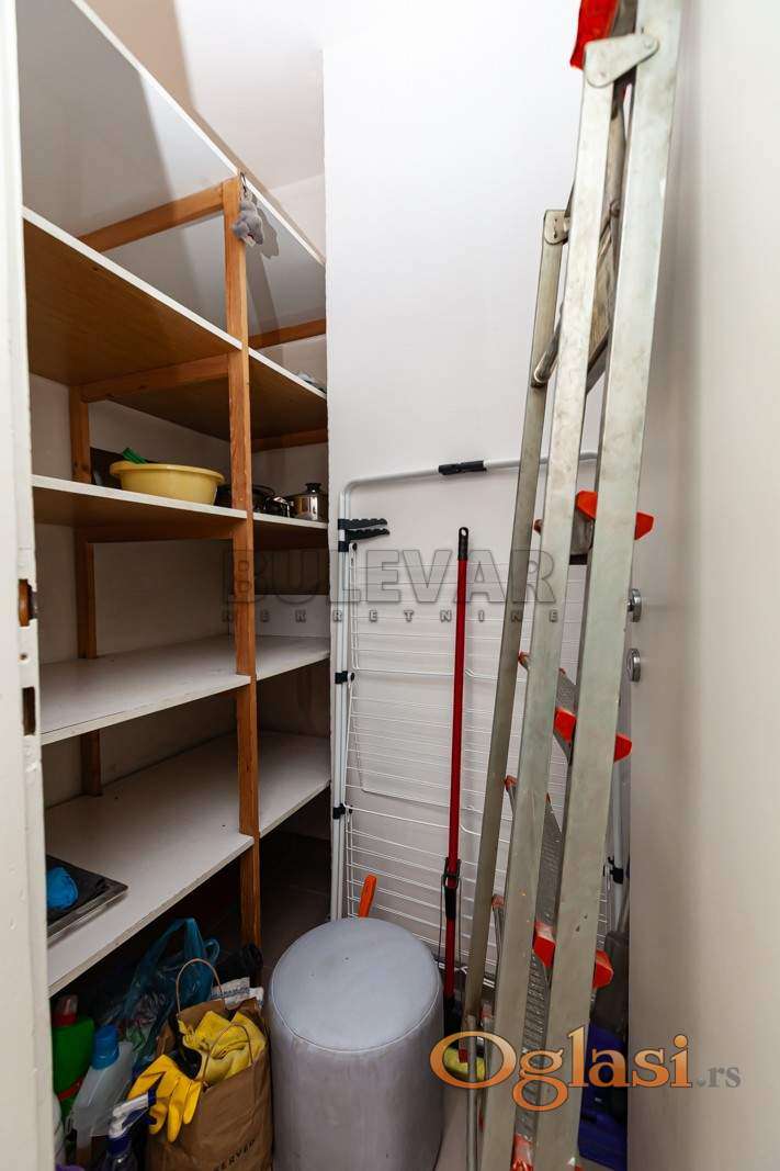 Nalazi se u zgradi starije, vrhunskog kvaliteta gradnje, spoljna PVC stolarija sa roletnama (na daljinsko upravljanje), na podu je parket odlično očuvan, keramika i sanitarija u kuhinji i kupatilu vrhunskog kvaliteta. Prodaje se kompletno opremljen nameštajem i tehnikom.
