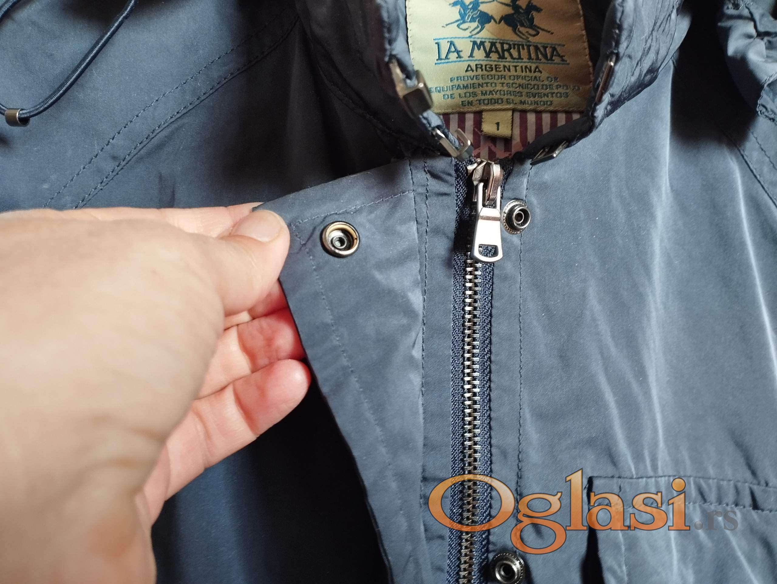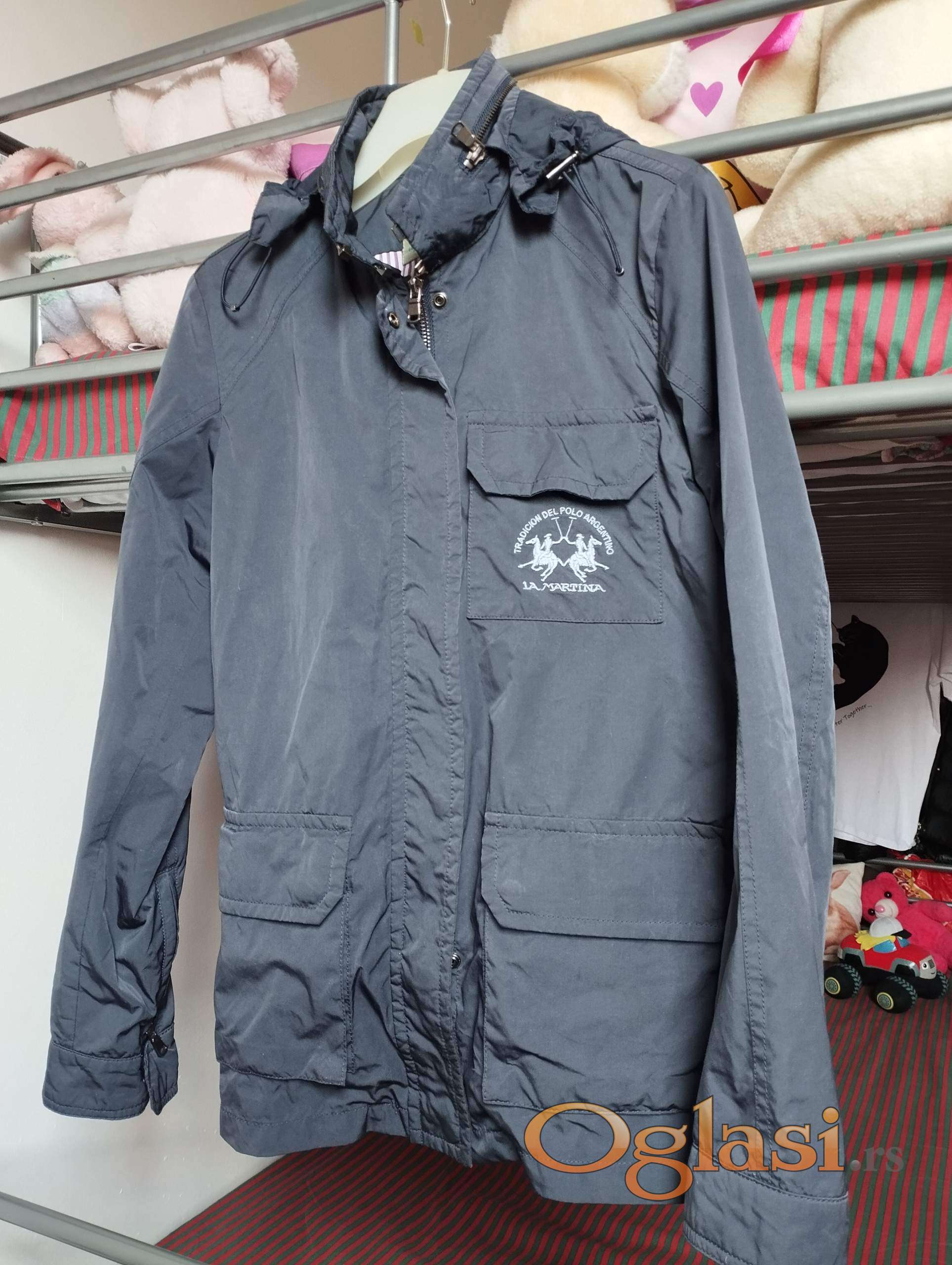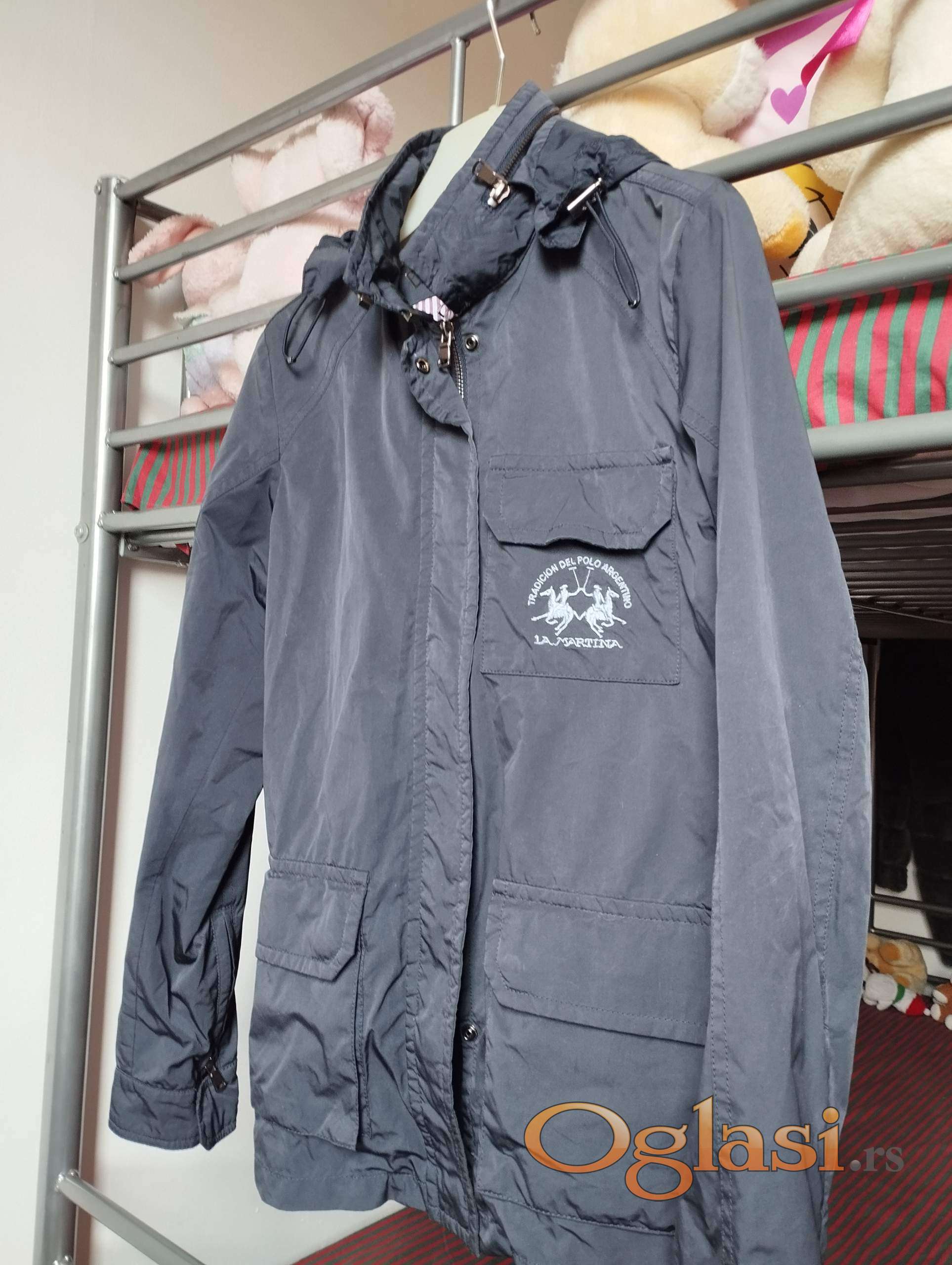 La Martina dečija ili tinejdžerska jakna za proleće ili jesen (polusezona) u tamno sivoj boji za devojčice uzrasta 8-10 godina. Visina je približno 140 cm (veličina 1). Širina u struku je 80 cm, dužina jakne od ramena do ruba je 65 cm, dužina rukava je 57 cm. Kapuljača se može skinuti, dužina rukava se može podesiti. Proizvedeno u Vijetnamu. 3 spoljna džepa i 3 unutrašnja džepa. Sastav: 70% poliester, 30% najlon, unutrašnja tkanina - pamuk. Troškove poštarine snosi kupac. Tel. 0603287612