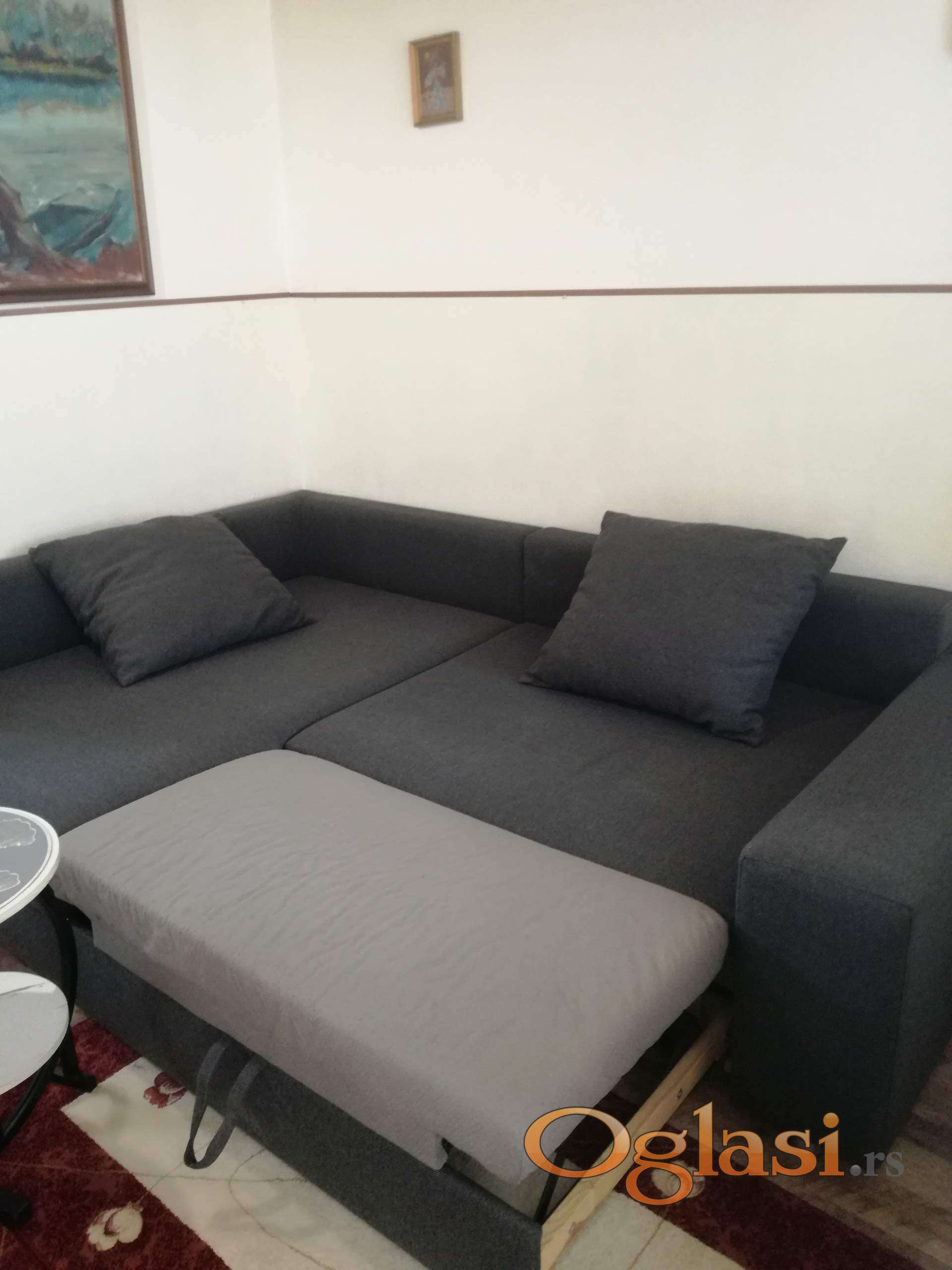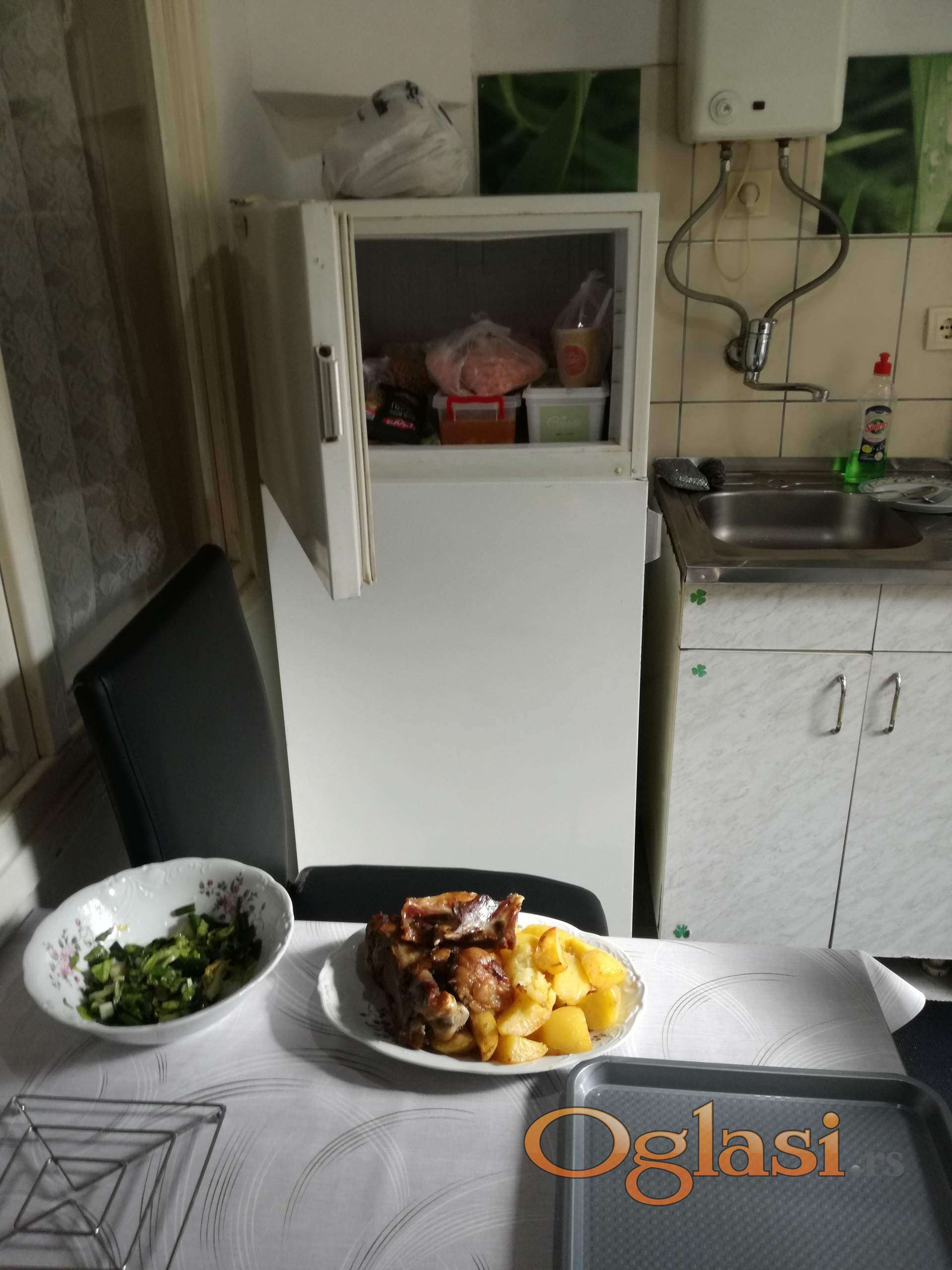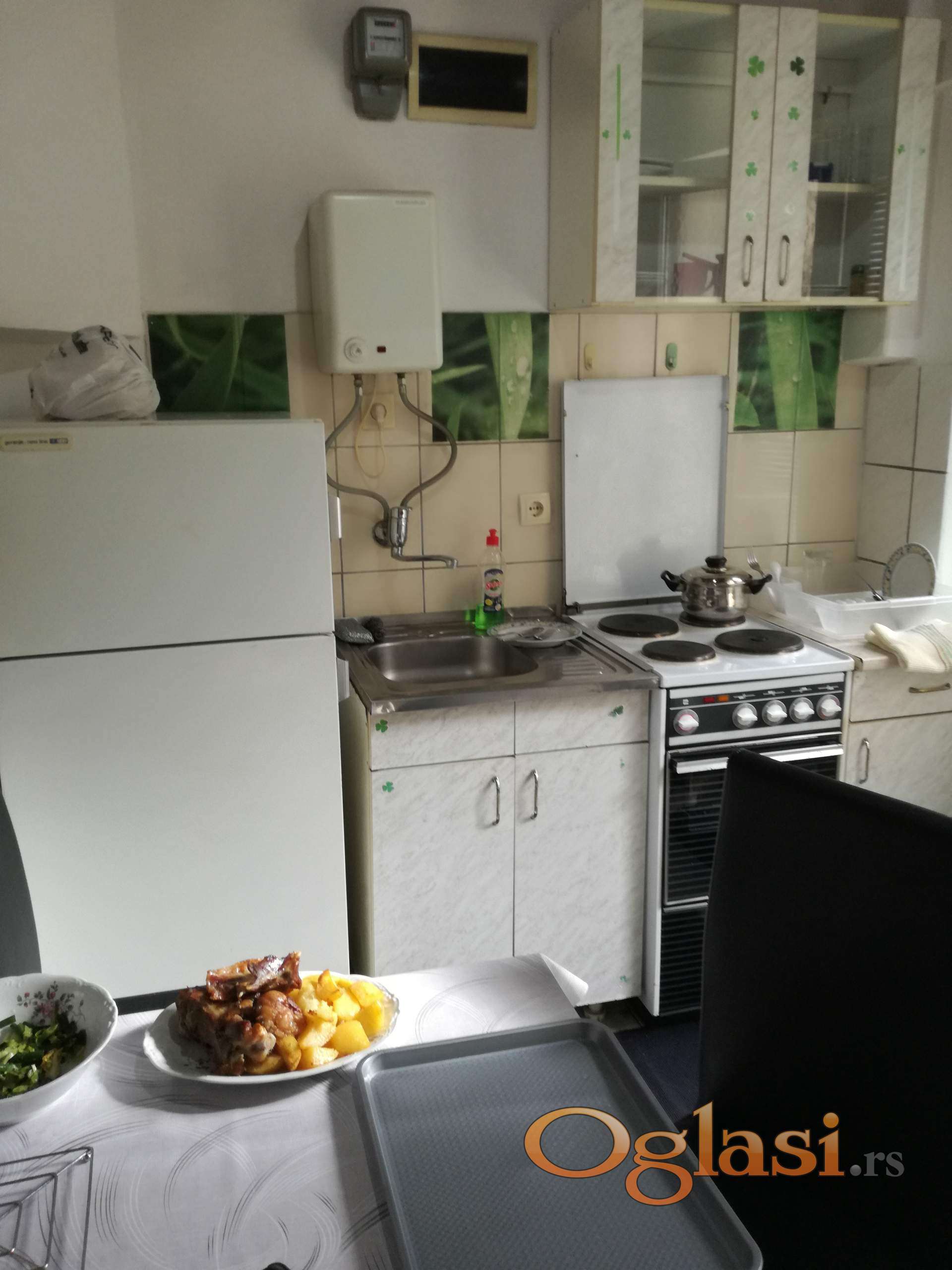 Garsonjera je odmah useljiva . Depozit 150 E. Mesečni troškovi mali jer wifi i informatika se plaća pola cene(oko 8000-8500 din).Tri prostorije : Kuhinja,soba i kupatilo.Ugaoni ležaj se razvlači u dva ležaja pa se dobija prostran bračni krevet(slika 6 i 7)), ormar, cipelarnik,TV, klima uređaj, veš mašina, žica za sušenje veša,usisivač, pegla na paru. Iznad kupatila je mali tavan za ostavljanje robe, leti zimske a zimi obnuto,kao i torbi i kutija od selidbe. Sve ostalo se vidi na fotografijama. Na 150m je autobuska okretnica za sve delove grada. Preporučljivo za 1 osobu.Sve nenamerne kvarove otklanjam o svom trošku. No pets!
