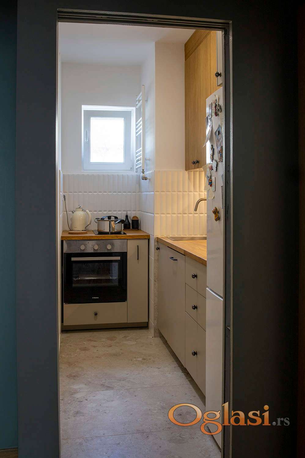 Ugradna kuhinja (frontovi furnirani MDF i farbani MDF, okovi Bloom; Bosh ugradna sudomasina i frizider, Hansa rerna i Tesla indukciona grejna ploca), ugradni plakar u hodniku i u većoj sobi (farbani MDF).