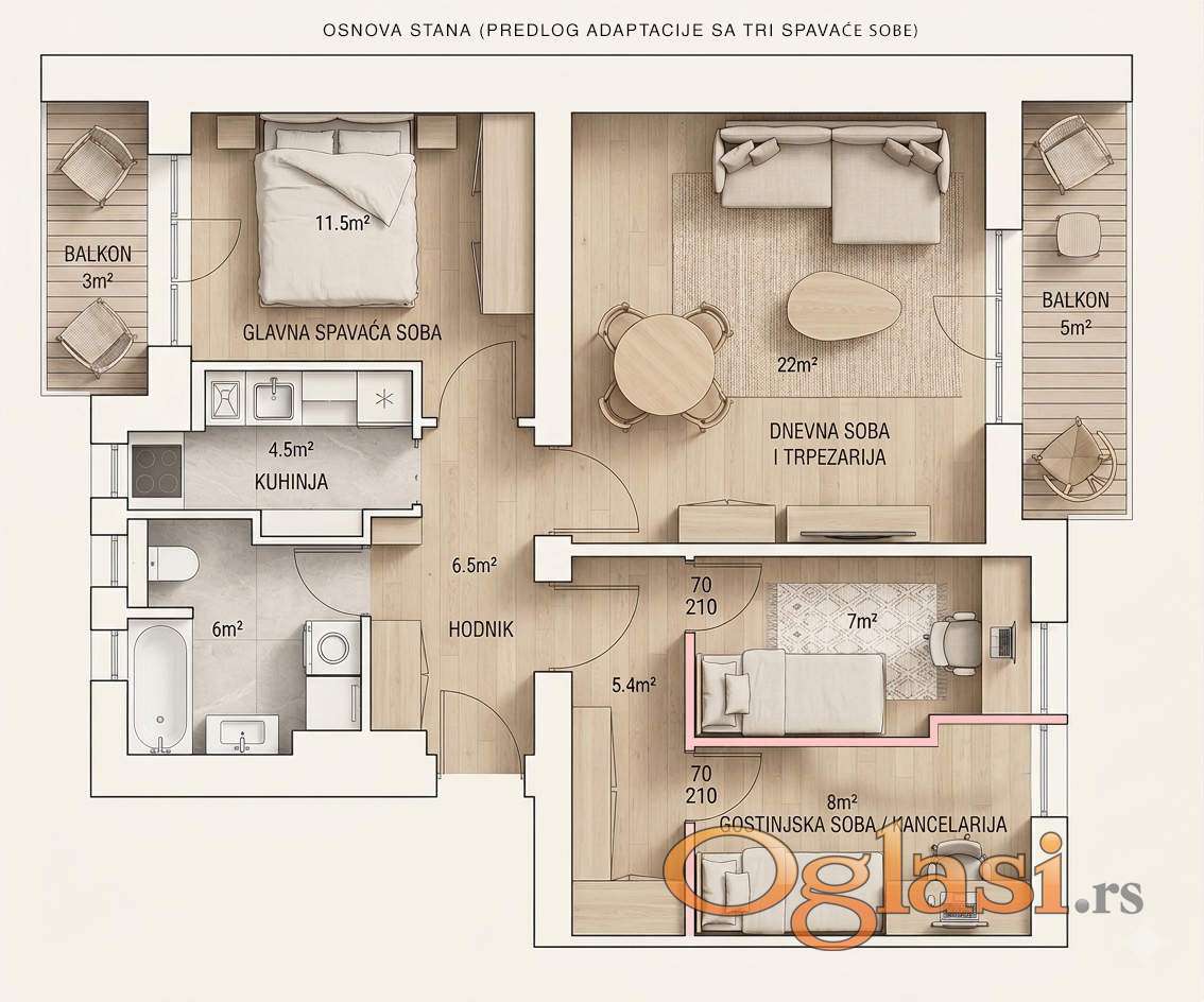 Od velike spavaće sobe se lako mogu gipsom pregraditi dve konforne dečije sobe, a manja terasa se može zastakliti te dobiti veci gabarit roditeljske sobe)