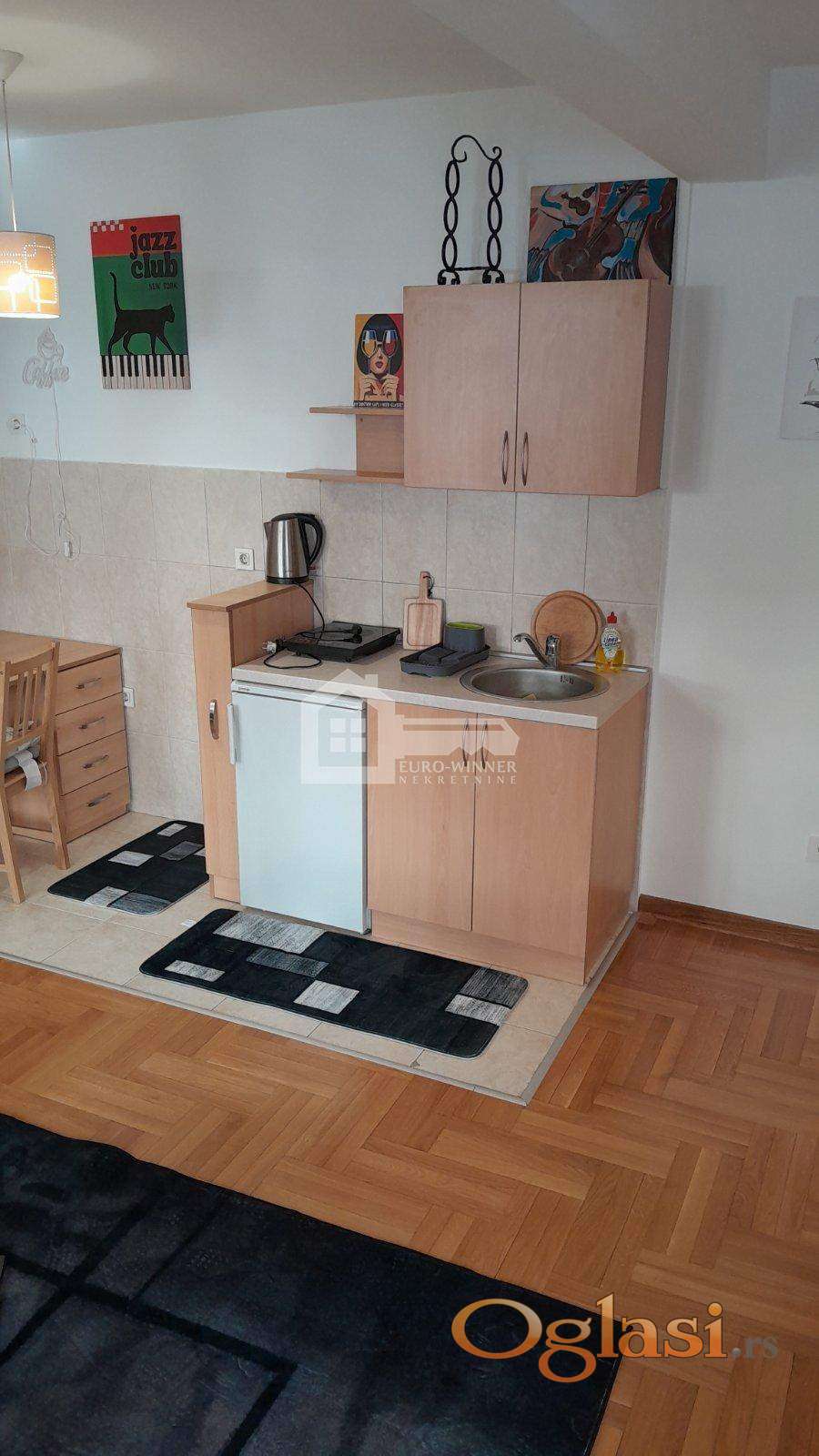 Prostorije: ulaz,kombinovani dnevni boravak sa čajnom kuhinjom,kupatilo i lođa.