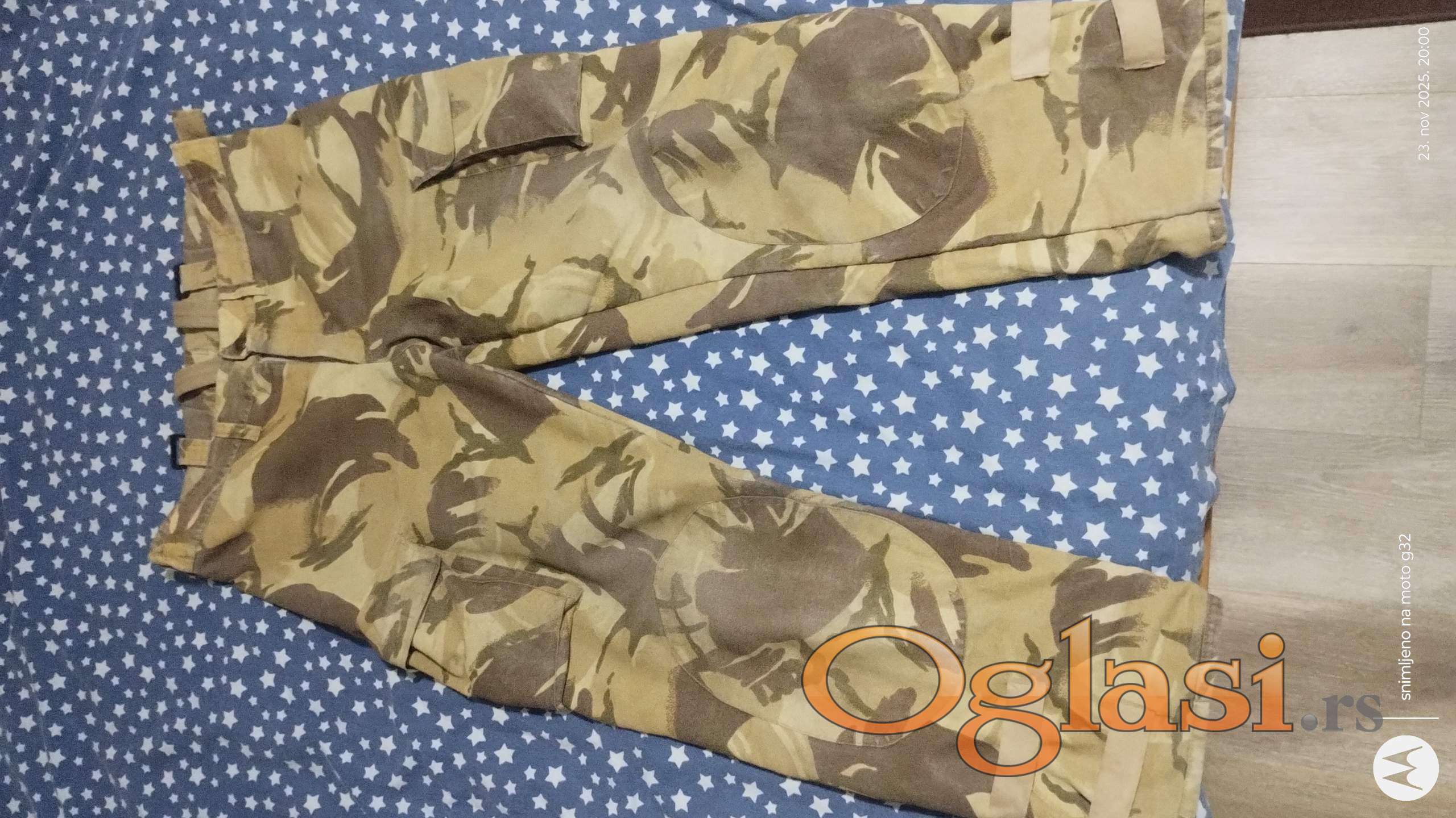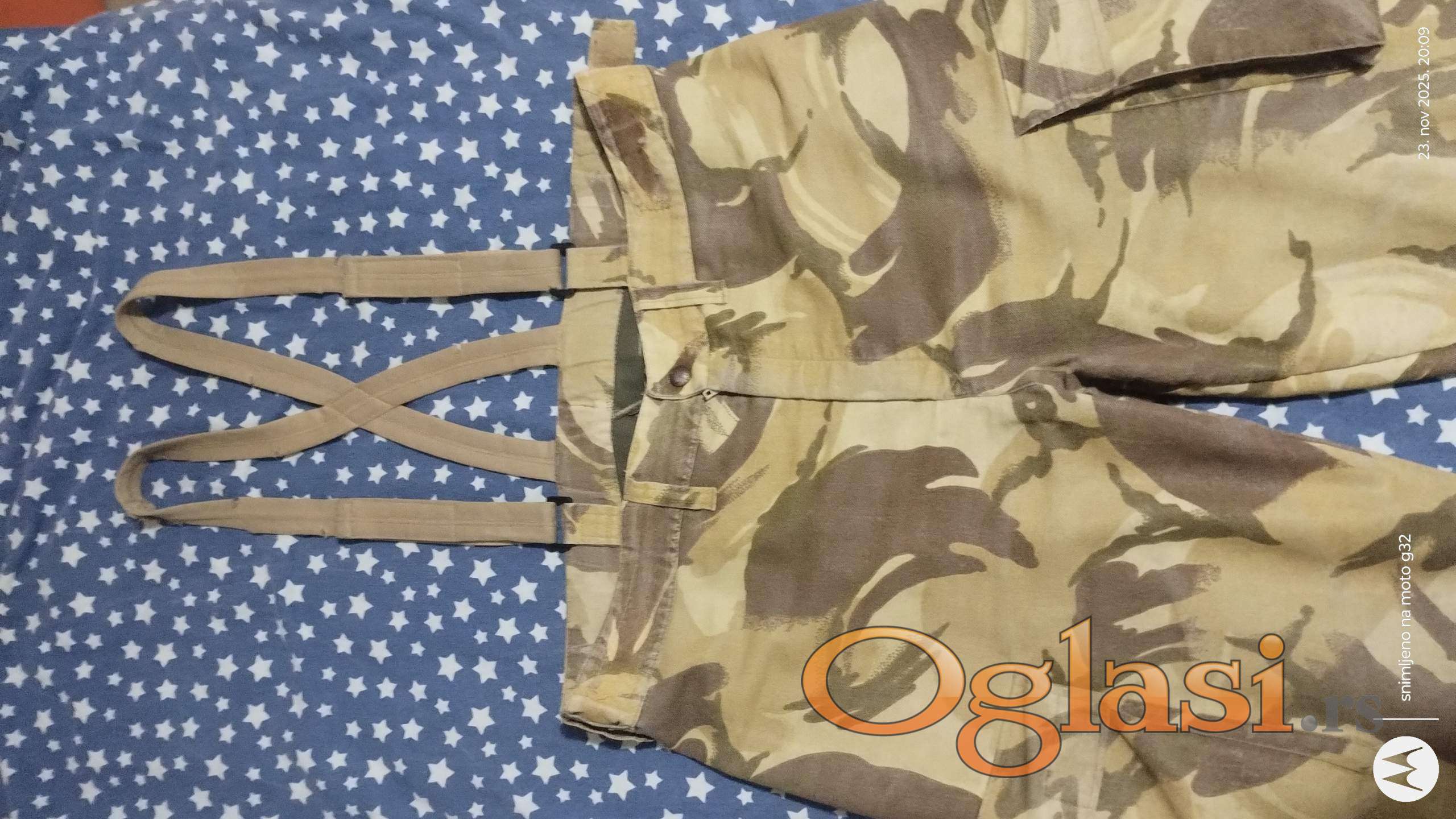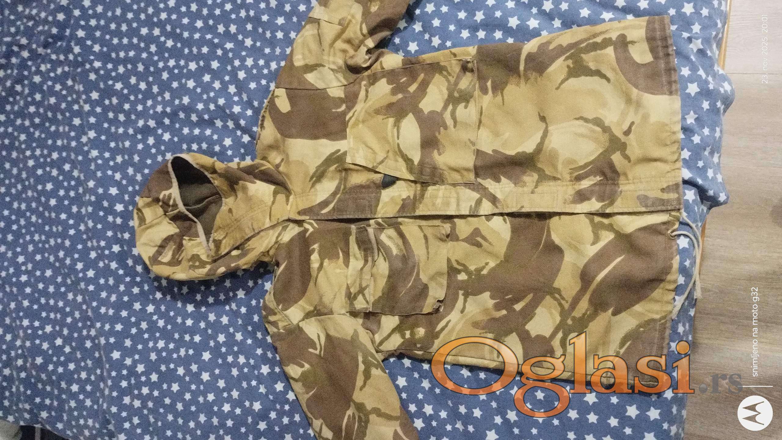 Prodaje se maskirno odelo za lov ili ribolov,šara pustinjska oluja,odelo je dosta jako za prolazak kroz šiblje,trsku i ostale terene. Komplet odelo je teško oko 2.5kg šiveno od vojnog duplog platna,vodootporno je na slabiju kišu. Ima manje oštećenje na tregerima pantalona što se vidi i na slikama ali su i dalje funkcionalni., zato i jeste ta cena. Cena je fiksna.