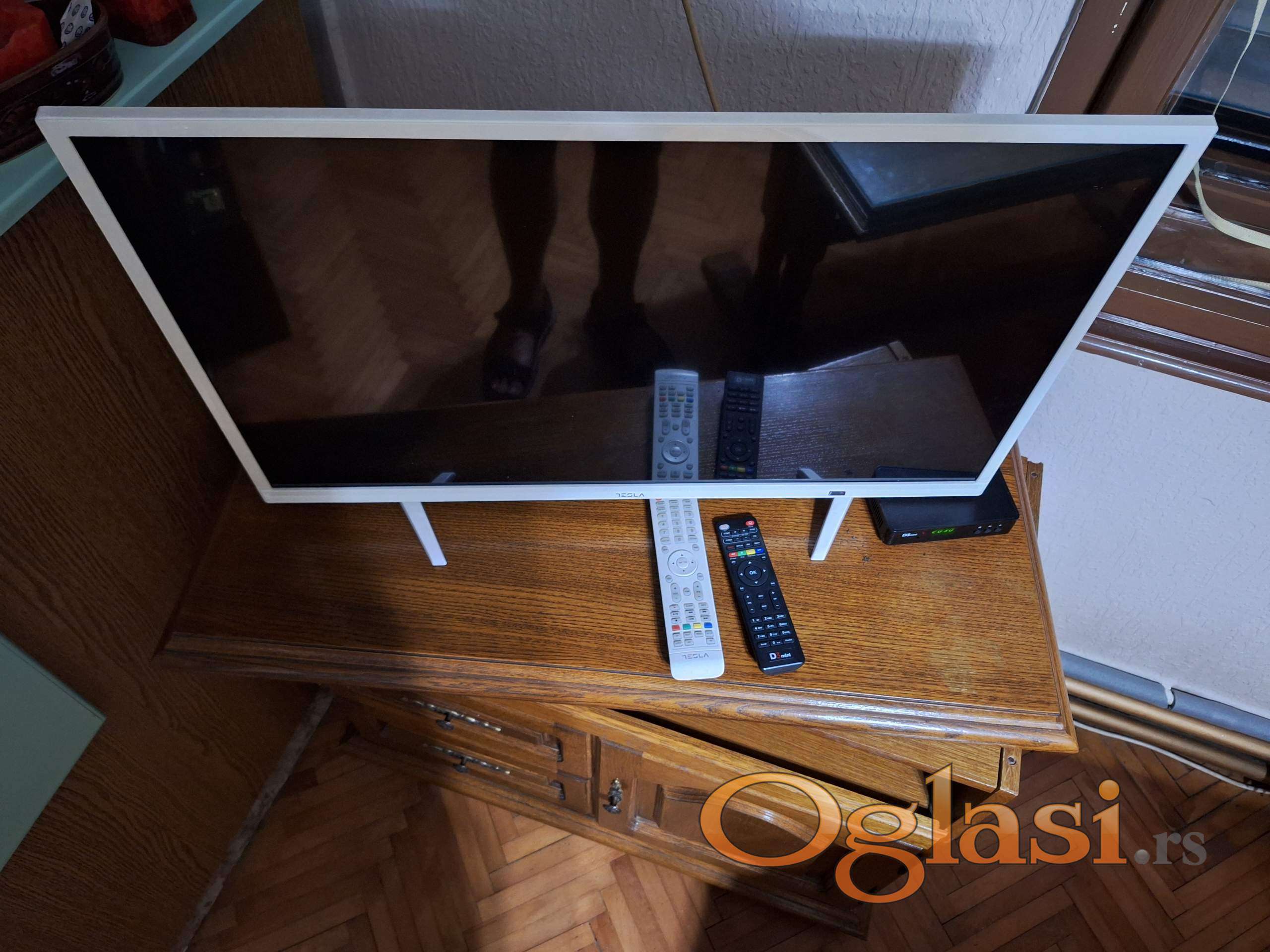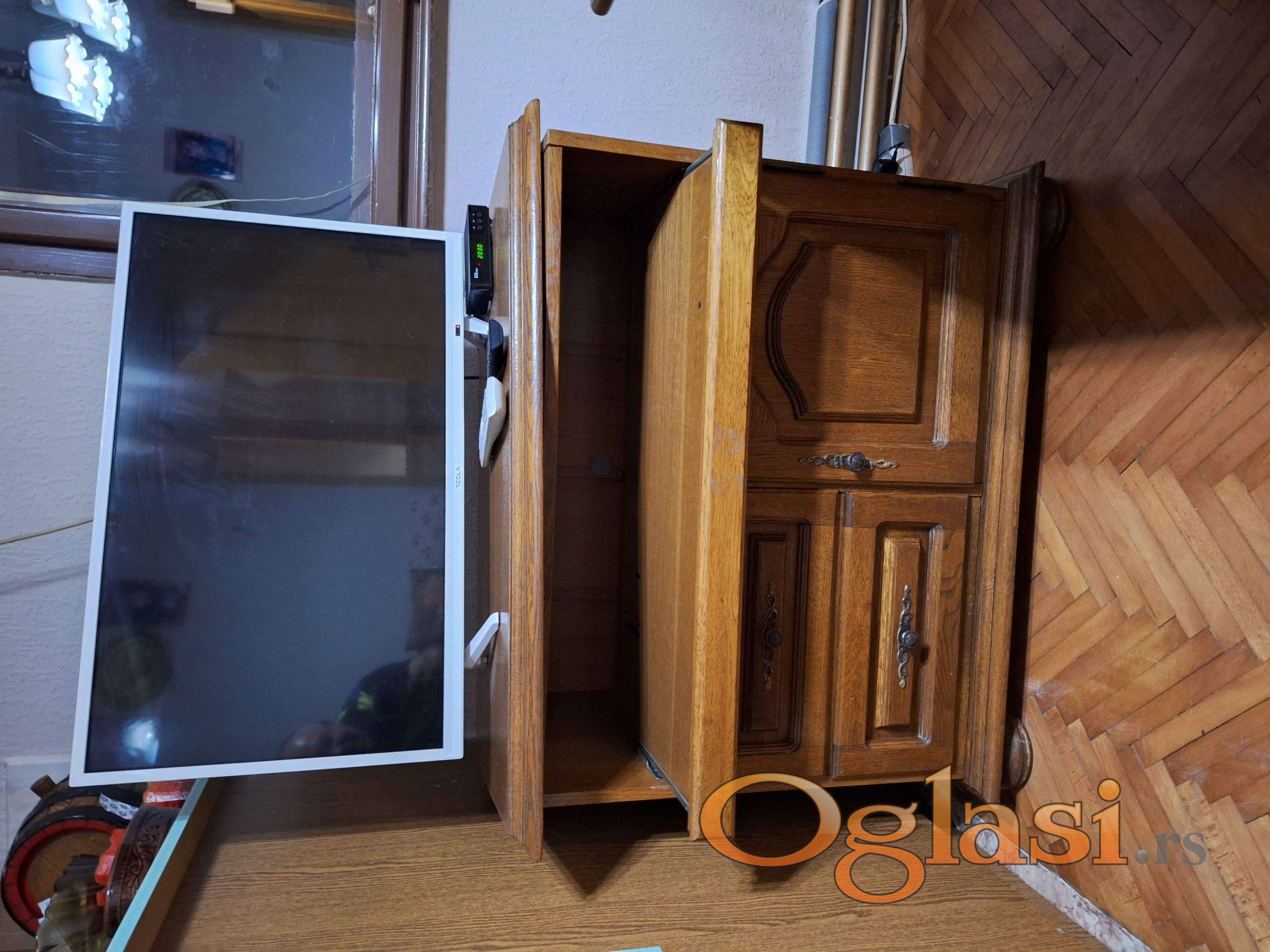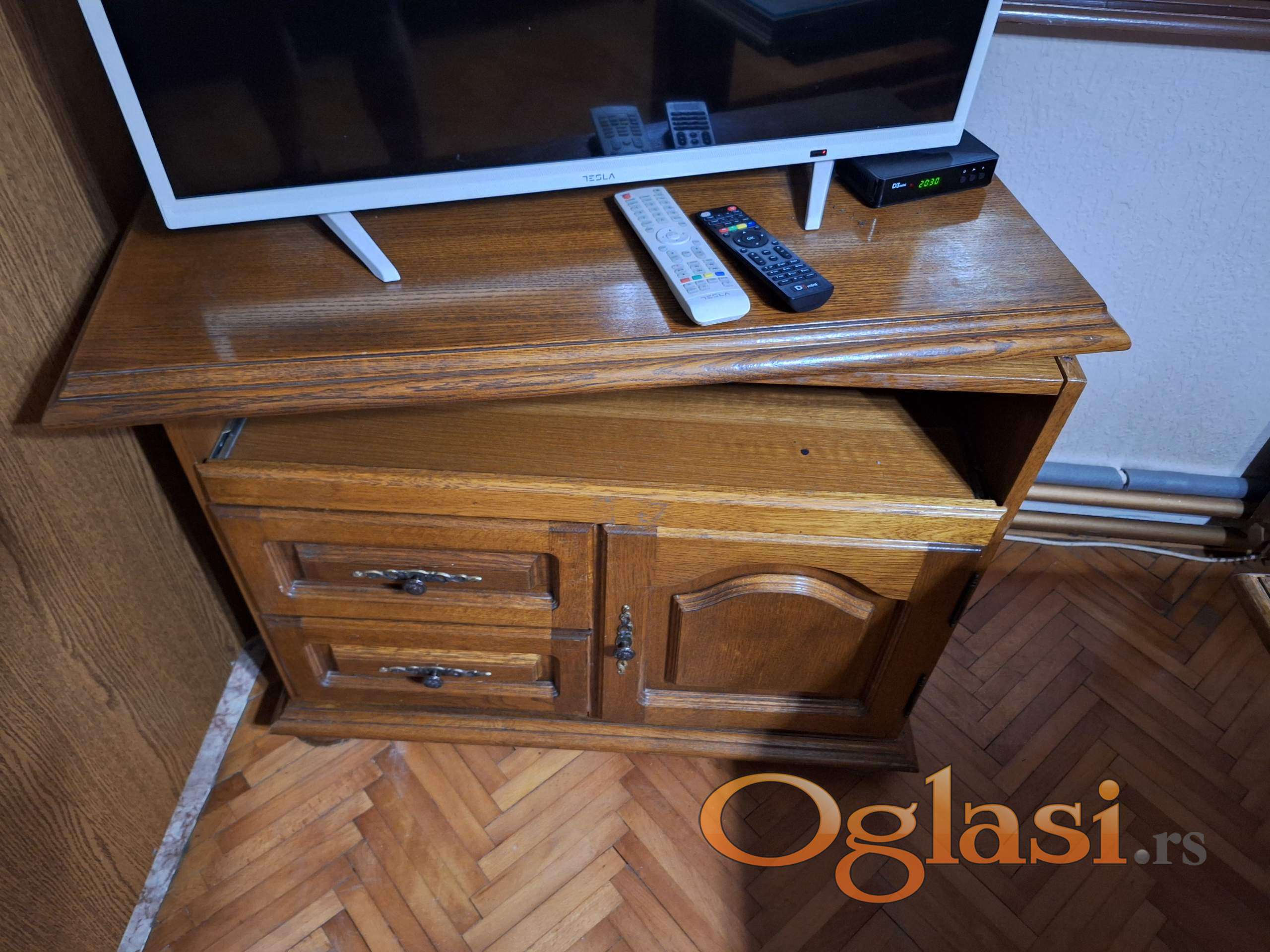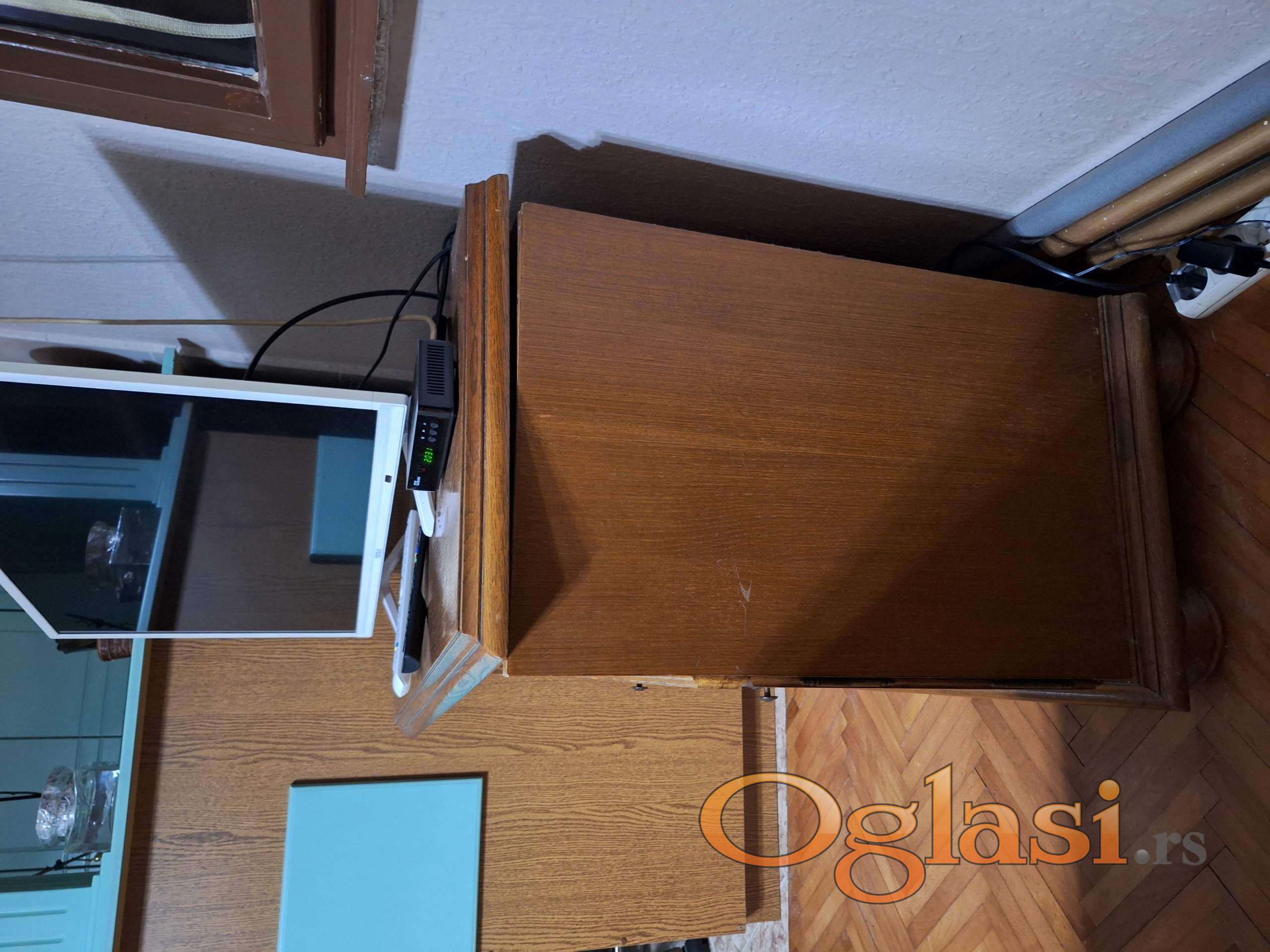 - Komoda za televizor (bez televizora) takodje od drveta sa rotirajućom gornjom pločom Dimenzije: (Širina x Dubina x Visina) u cm: 90 x 46 x 78