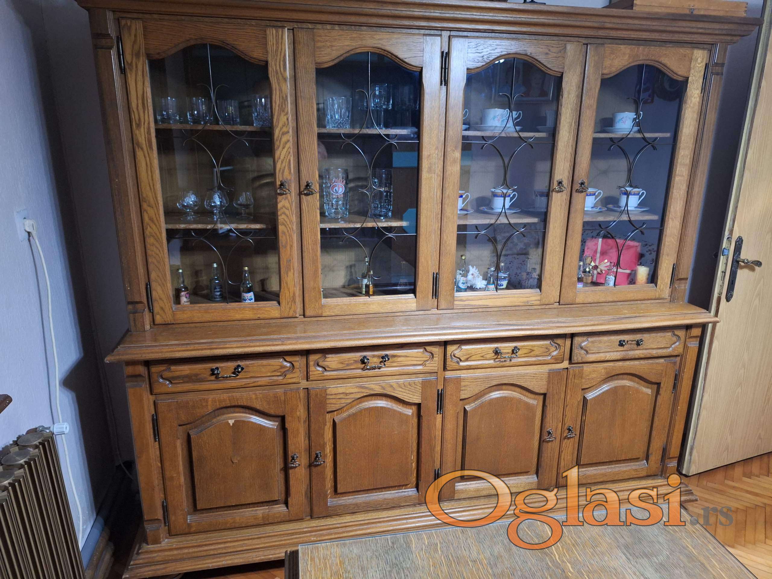- Vitrina iz dva dela u kombinaciji drveta i stakla sa metalnim ukrasima preko stakla Dimenzije: (Širina x Dubina x Visina) u cm: 208 x 50 x 187