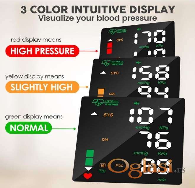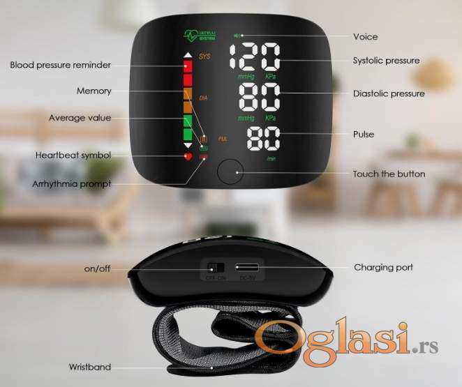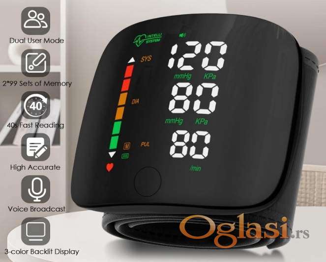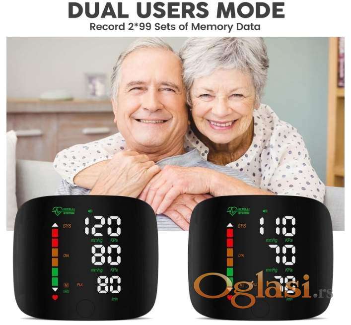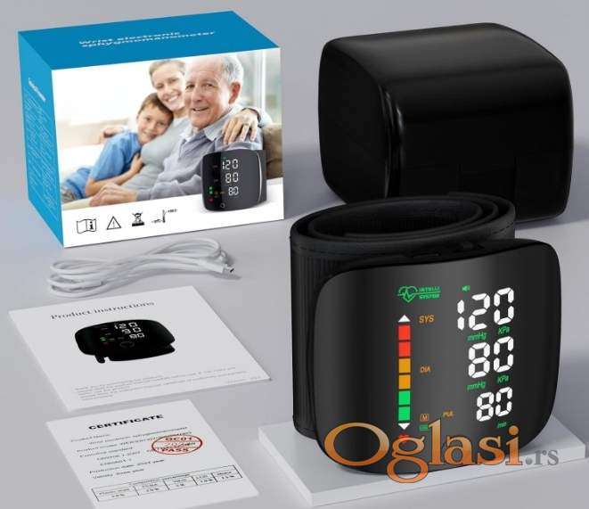 Digitalni zglobni merač pritiska i pulsa, NEOTPAKOVAN, pogodan za brzo i precizno merenje, jednostavan za upotrebu, 2 x 99 memorija (mogu ga koristiti dve osobe), detektuje aritmiju, prikazuje prosečne vrednosti izmerenih rezultata, veliki kolor ekran, punjiva baterija (kabl za punjenje uključen).
