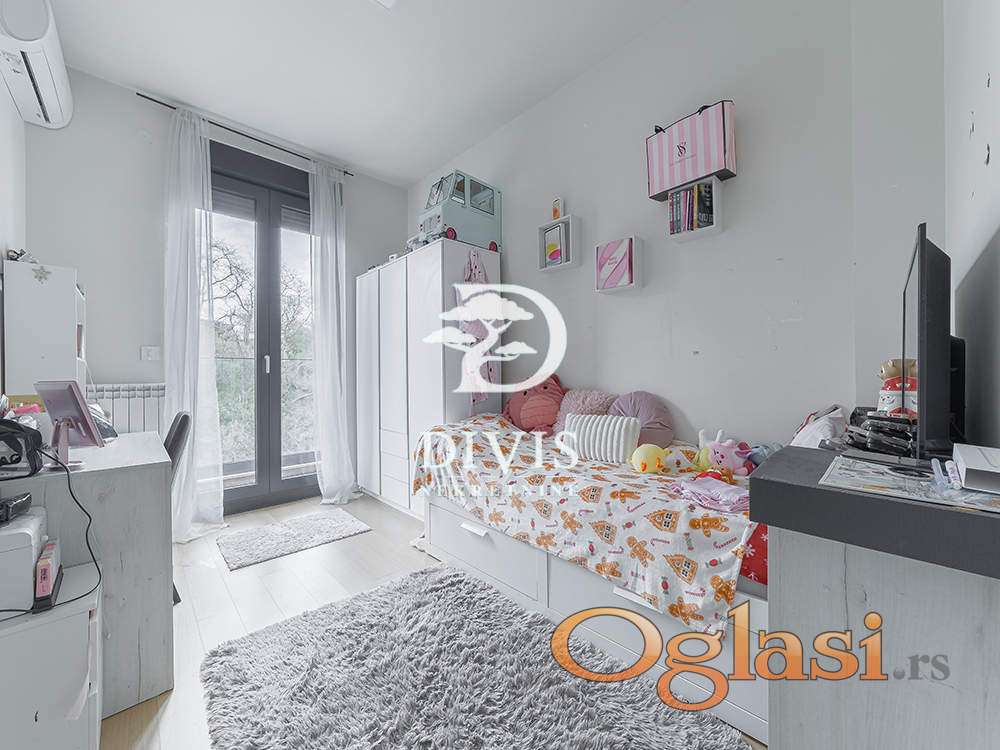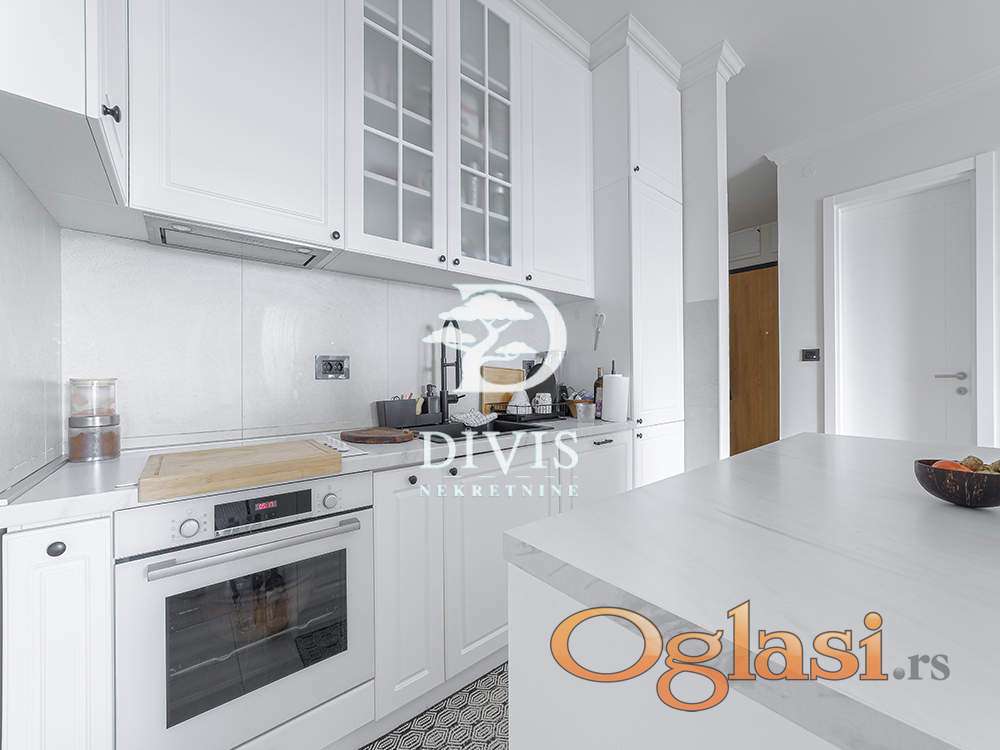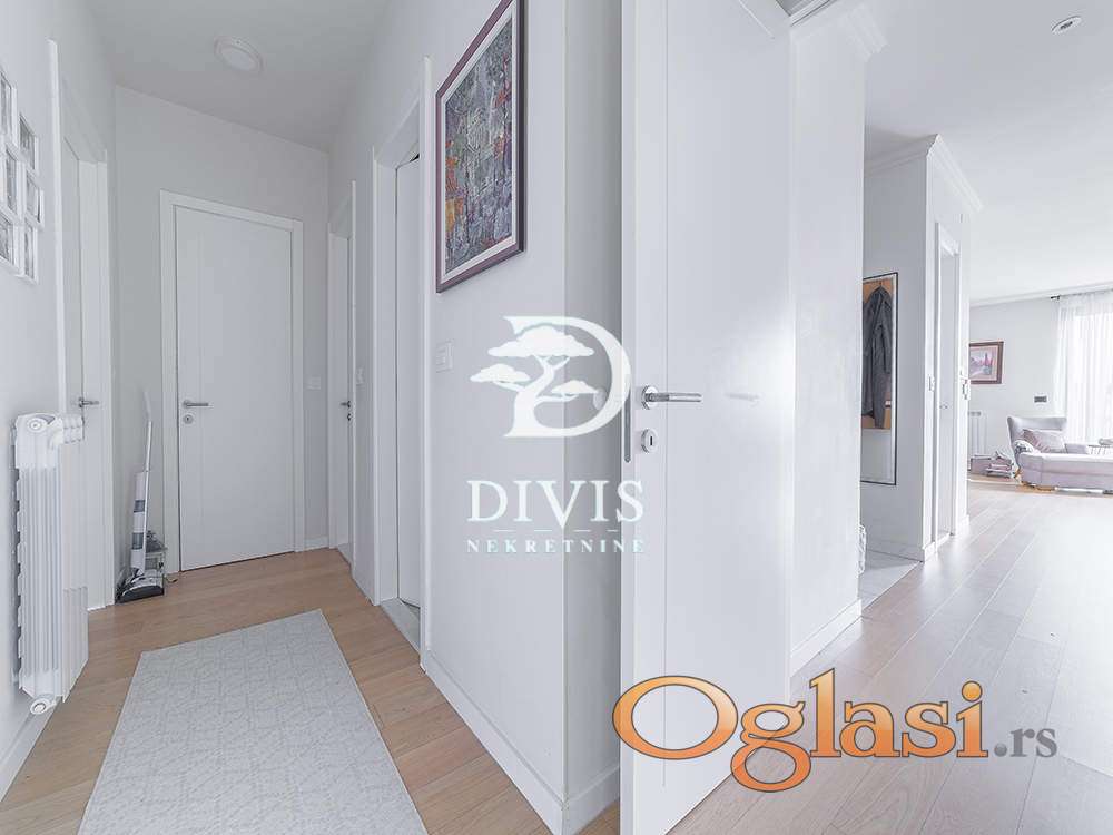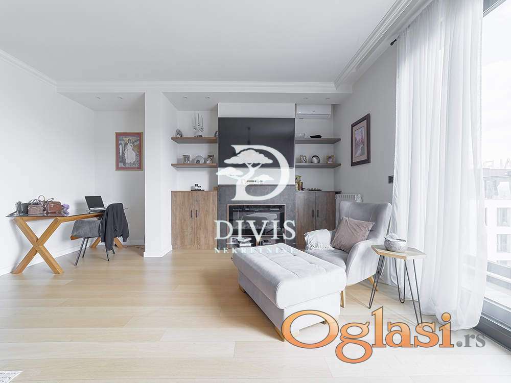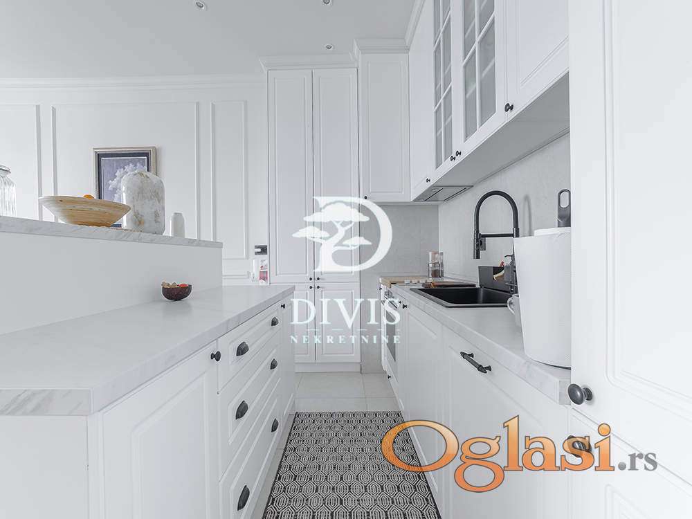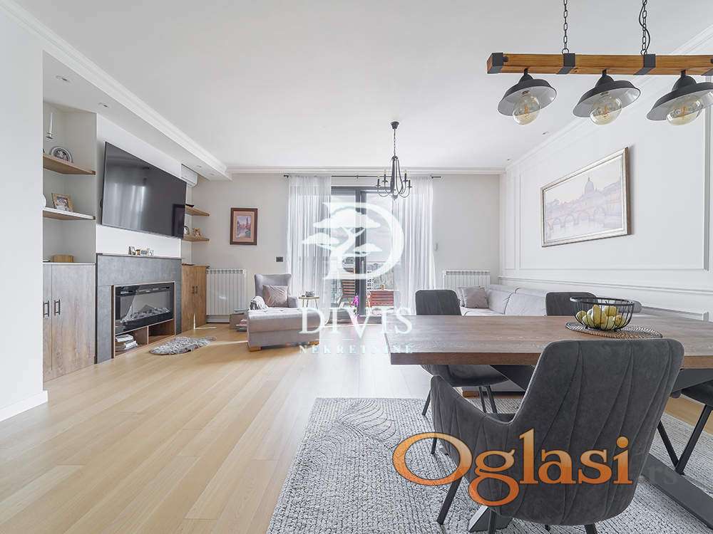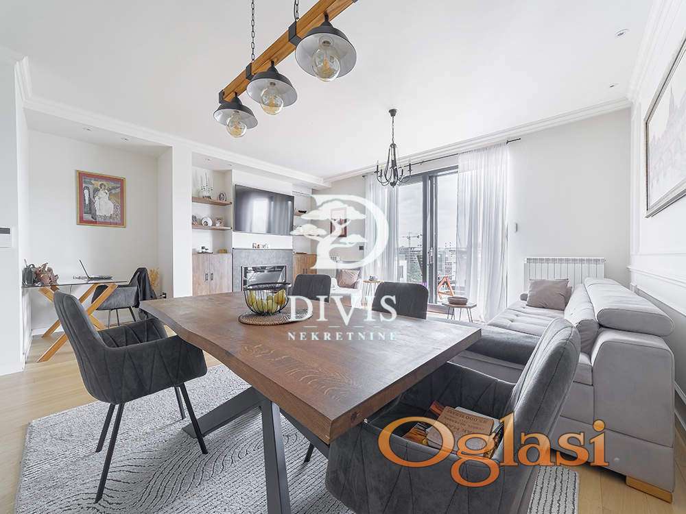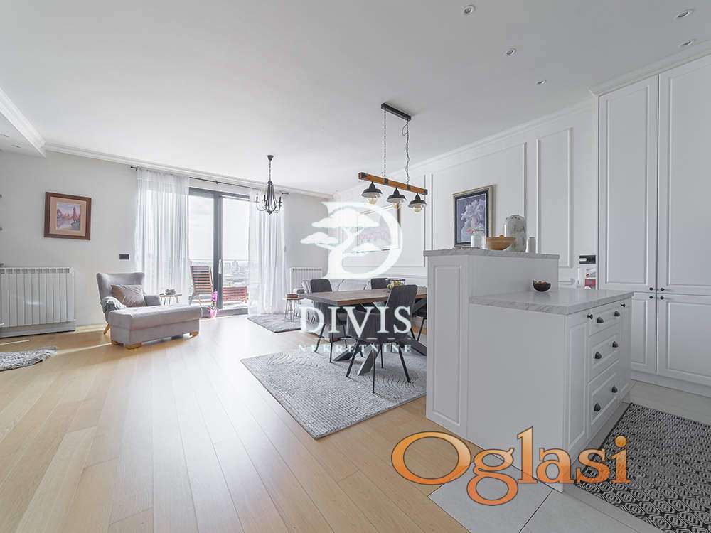 Ovaj luksuzni stan ima ukupnu površinu od 138m2, prostran dnevni boravak sa kuhinjom i trpezarijom, master sobu sa walk-in garderoberom i kupatilom, dve dečije sobe, kupatilo, gostinjski toalet, ostavu, posebnu prostoriju za mašine za veš i 2 terase. Prodaje se kompletno opremljen i namešten. Kuhinja je radjena po meri kao i sve u stanu od ugradnog nameštaja.