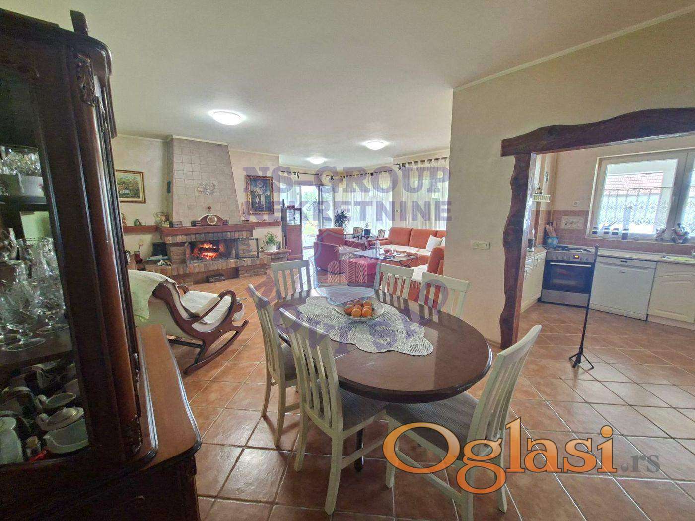 Predstavljamo Vam fantastičnu kuću nadomak Novog Sada u mestu Stepanovićevo. Izuzetan kvalitet gradnje i opreme. Sigurnostna ulazna vrata, PVC stolarija, podna obloga kombinacija keramike i hrastovog parketa, kvalitetna keramika i sanitarije, video nadzor, alarm... Komforan dnevni boravak sa kaminom, dve master spavaće sobe sa svojom kupatilom, odvojena kuhinja sa prirodnom ventilacijom, kupatilo. Odličan raspored. U dvorištu se nalaze pomoćne prostorije u vidu ostave, radionice, ostave za ogrev, pušnice. Poseban akcenat stavljamo na prelepi zidani rostilj koji ima mogućnosti pečenjare, pekare i do kog je sprevedena struja i voda. Prava oaza mira za porodicu koja traži mir na svega nekoliko kilometara od grada. Za više informacija kao i za zakazivanje gledanja ove prelep kuće pozovite naše agente prodaje.