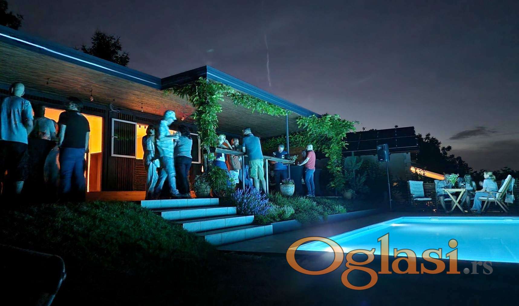 7.5x3.5x1.5m, zidani pravougaoni skimer bazen sa kompletnom opremom, uključujući masažer i pumpu za dogrevanje vode, mlaznica za plivanje. Prostrana plaža za ležaljke ispod koje je mašinska soba za bazen.