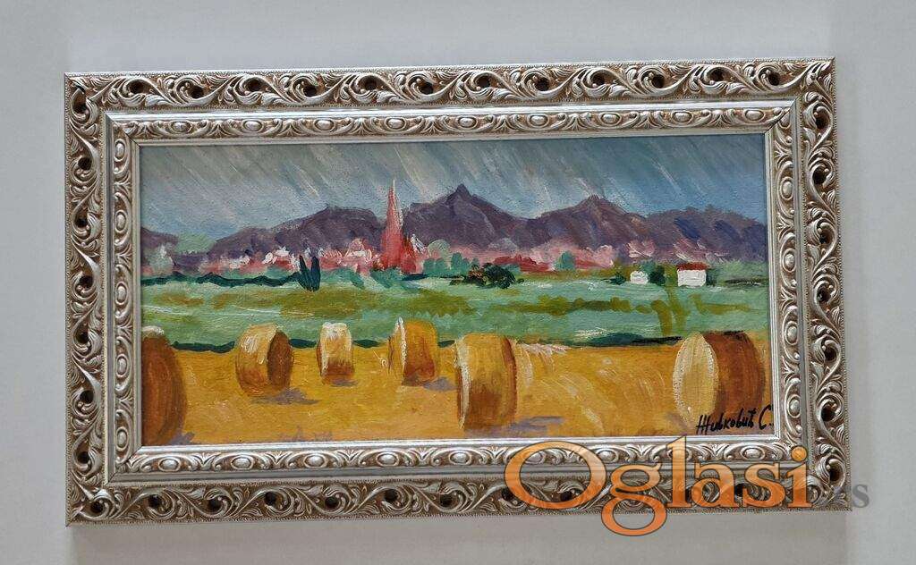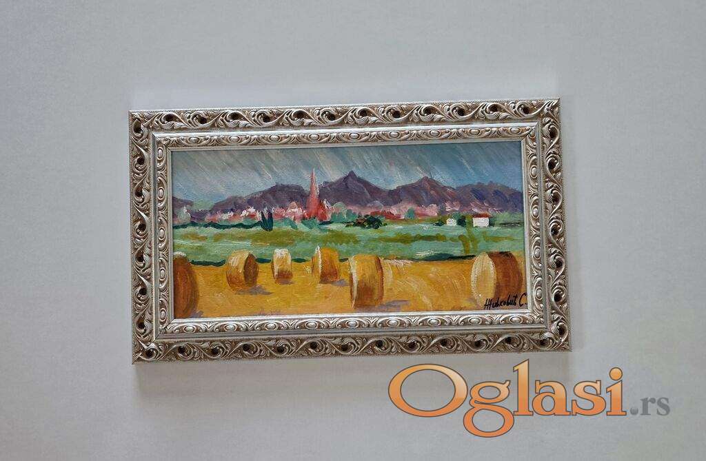 Ulje na platnu Miris pokosenog sena, prelepo umetnicko delo. Slika je uramljena u jako lep ram, dimenzije slike sa ramom 50 x 30. Privatna kolekcija.