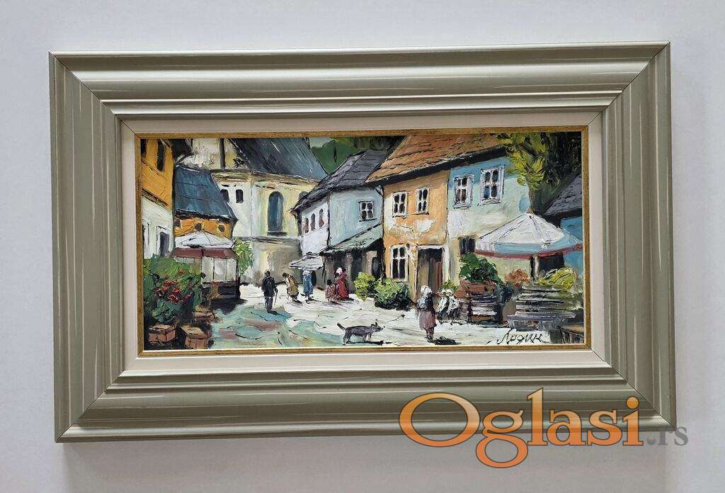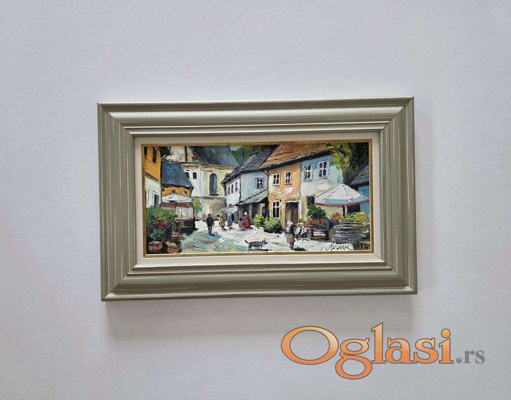 Ulje na lesonitu U starom gradu, prelepo umetnicko delo. Slika je uramljena u jako lep ram, dimenzije slike sa ramom 55 x 35. Privatna kolekcija.