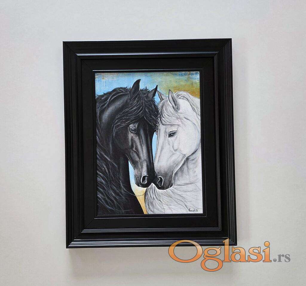 Slika Konji, spoj suprotnosti. Tehnika akril na platnu. Prelepo umetnicko delo. Slika je uramljena u jako lep ram, dimenzije slike sa ramom 56 x 46. Privatna kolekcija.