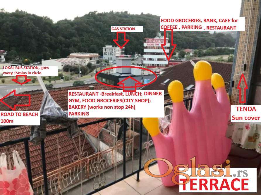 Inače na fotografiji sam označila koliko je udaljen stan od drugih objekata, najvažnije je da je plaža na 100 metara od stana i da se vrlo lako može do nje stići. Ili peške ili kolima, a pored stana postoji parking-garaža koja se može iznajmiti za povoljan iznos, to ću Vam proslediti broj telefona od komšija, ili ću Vam rezervisati u Vaše ime, nakon rezervacije i ovog našeg smeštaja.