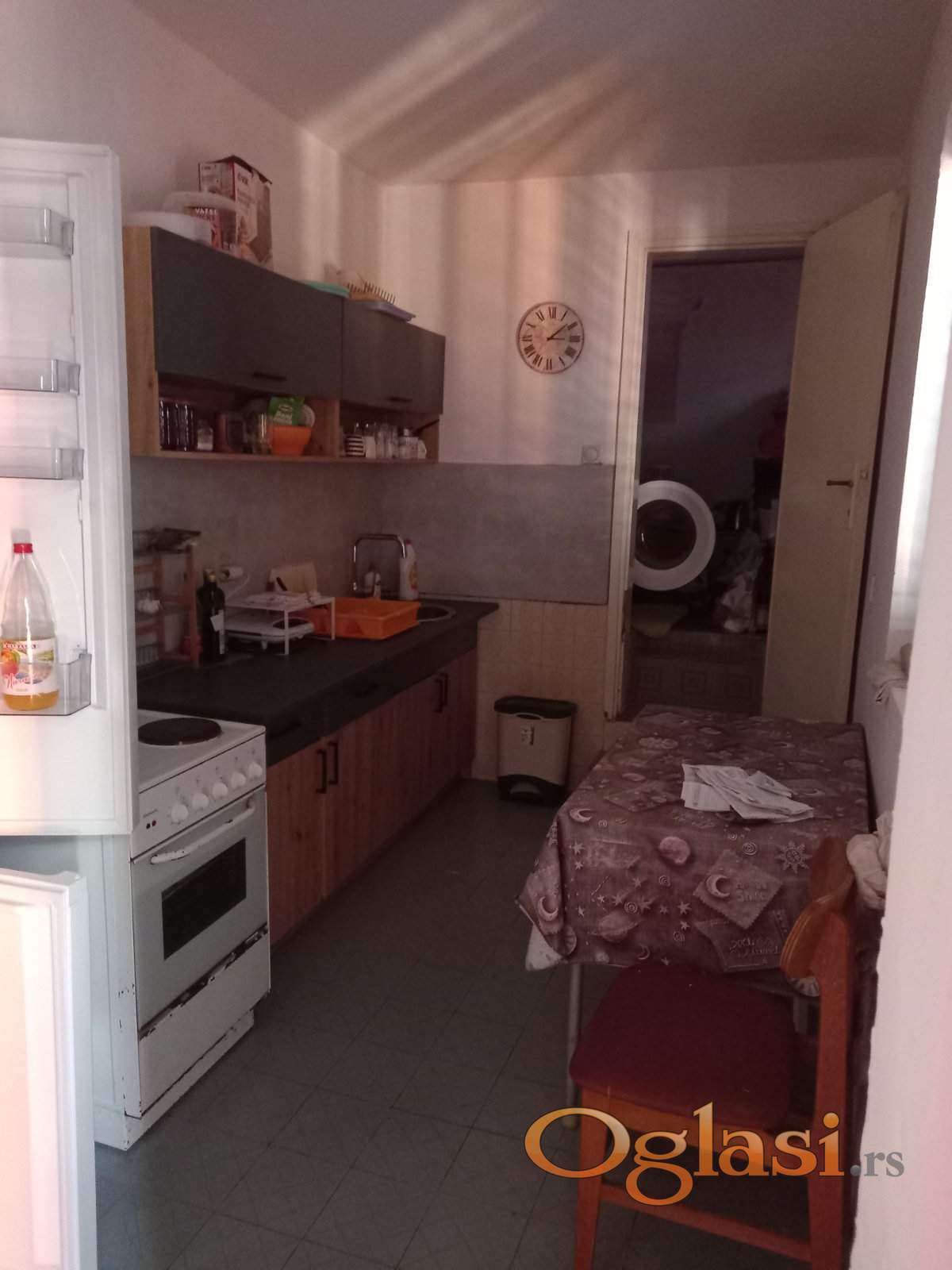 Kuhinja je takođe renovirana, sa frižiderom, sudoperom i česmom sa toplom vodom, a tu je u nastavku i špajz sa veš mašinom(ako treba), ali uglavnom za ostavljanje lubenica, i ostalih zaliha za hranu. Tu je i električan roštilj, i električna talandara, ako ima potrebe za time, to se radi ili na terasi ili napolju na hodniku uz apartman.