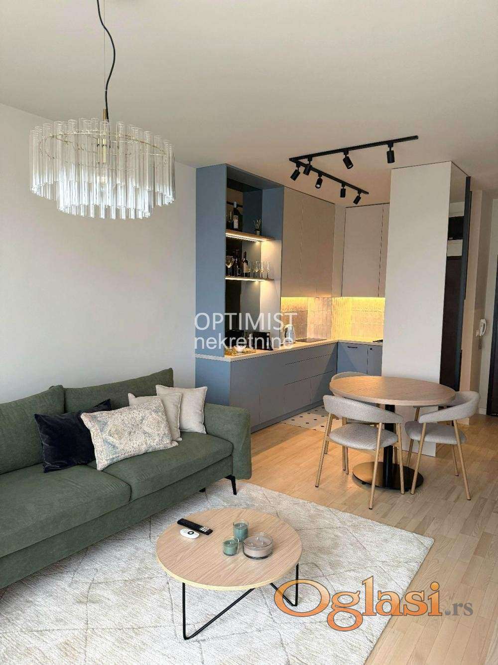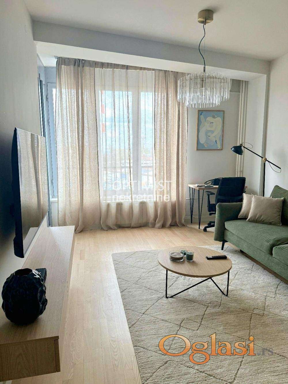 Stan je kompletno opremljen – mašina za sudove, mašina za pranje i sušenje veša, frižider, zamrzivač, svi kuhinjski aparati i prateći dodaci, kao i radni sto i ergonomska radna stolica, što ga čini idealnim za rad od kuće.