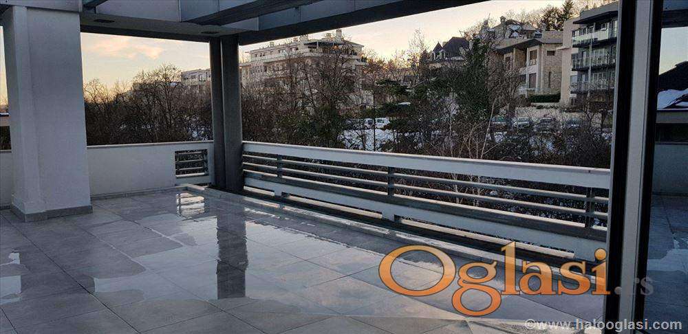 Nalazi se na drugom, poslednjem spratu, sa ogromnom terasom od 110m2 koja pripada samo ovom stanu. Takođe ima i ostavu od 16m2 i garažu koja je uključena u cenu.