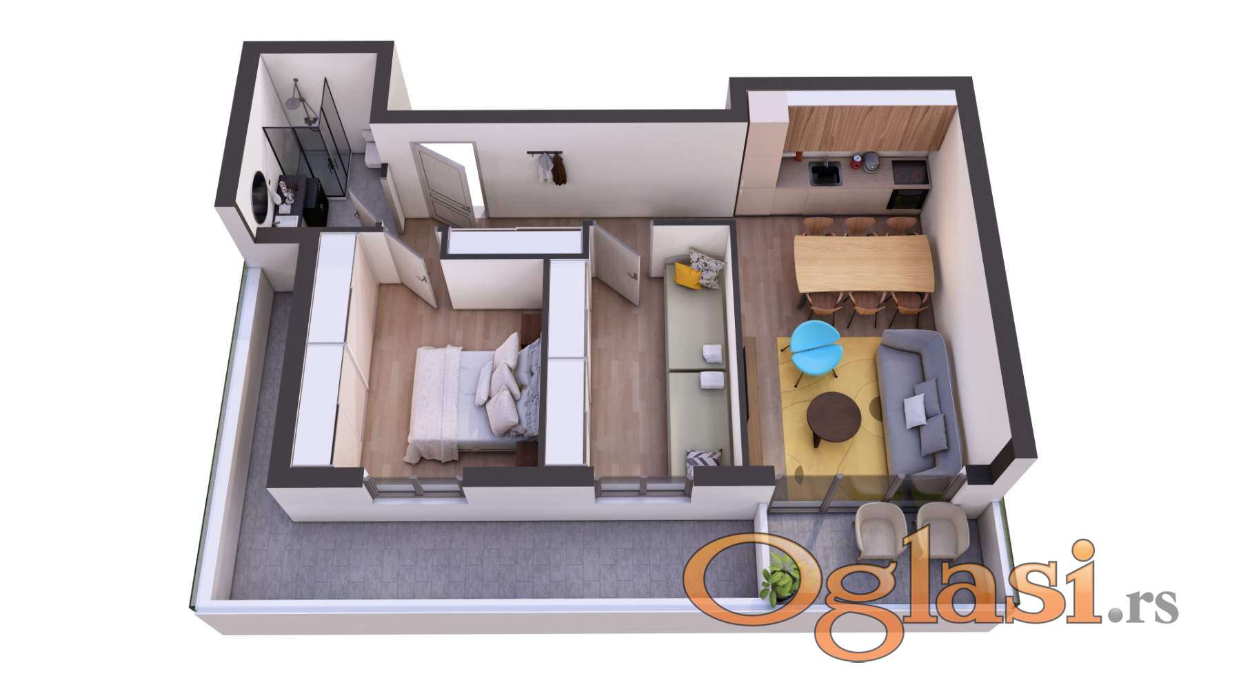 Raspored stana je izuzetno funkcionalan i maksimalno iskorišćen, sa pažljivo organizovanim prostorom gde je svaki kvadrat pametno upotrebljen, pružajući komfor i praktičnost u svakodnevnom životu.