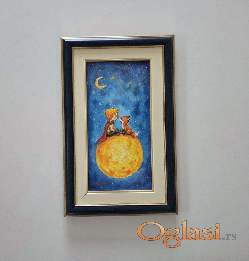 Ulje na platnu Svet malog princa, prelepo umetnicko delo. Slika je uramljena u jako lep ram, dimenzije slike sa ramom 55 x 35. Privatna kolekcija.