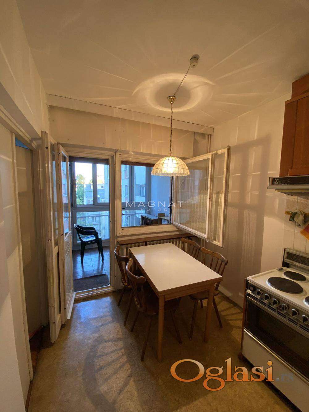 Stan je u izvornom, održavanom stanju, funkcionalnog rasporeda. Sastoji se od velikog dnevnog boravka, kuhinje sa trpezarijom, izdvojenog spavaćeg bloka, kupatila, kao i prostrane lođe od oko 5m² sa pogledom na zelenilo.