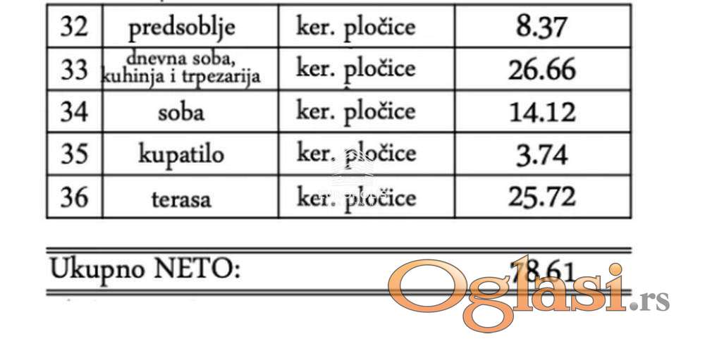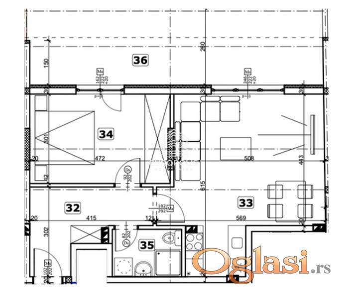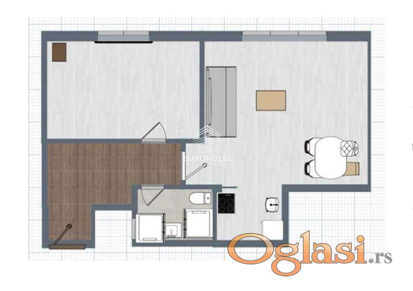 Raspored prostorija: ulazni hodnik, dnevna soba sa kuhinjom i trpezarijom, soba, terasa, kupatilo.