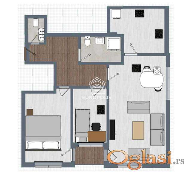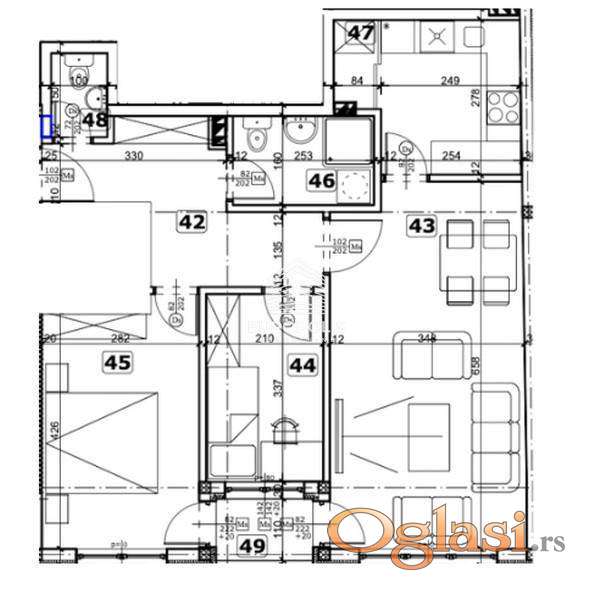 Raspored prostorija: ulazni hodnik, dnevna soba sa kuhinjom i trpezarijom, dve sobe, terasa, dve ostave, kupatilo.