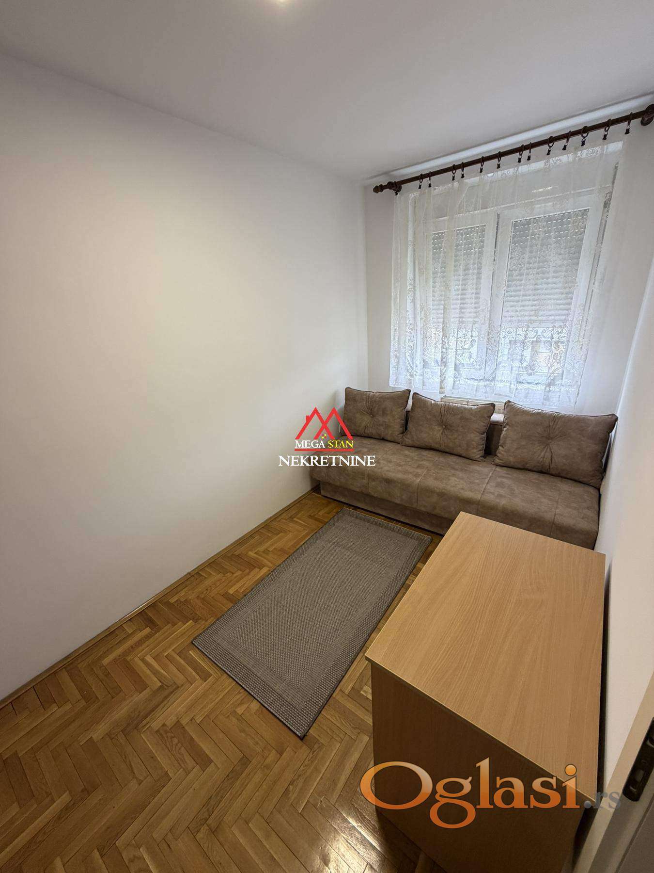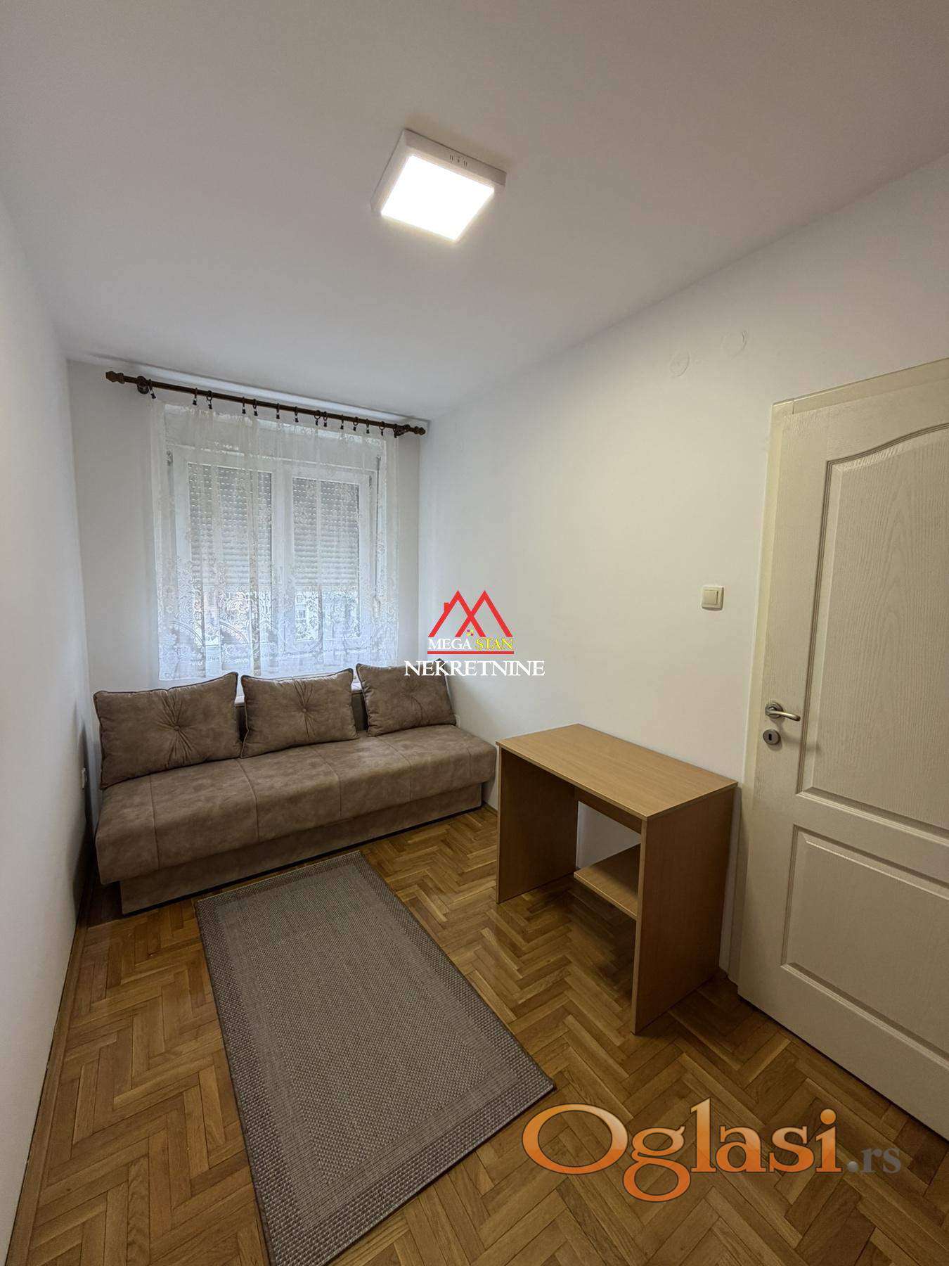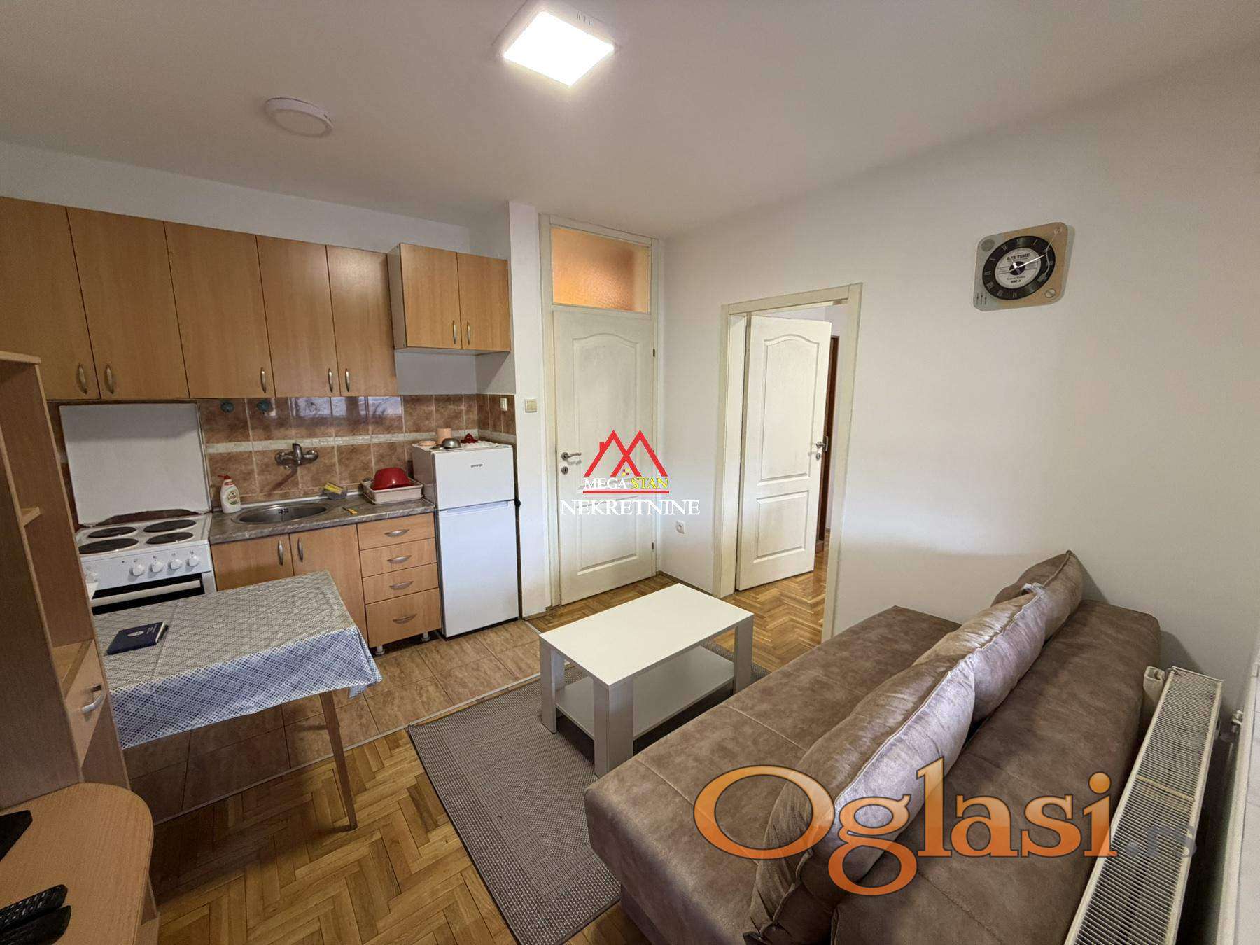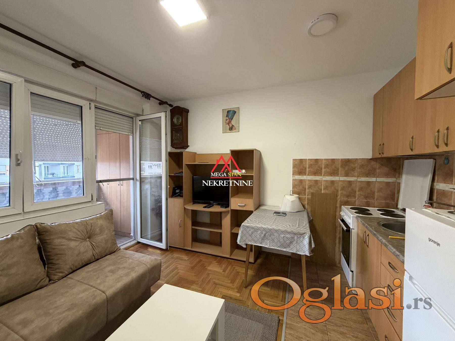 Stan je u potpunosti namešten i opremljen svim neophodnim nameštajem i uređajima za svakodnevni život. Raspored je praktičan i maksimalno iskorišćen, što prostor čini veoma prijatnim za boravak.