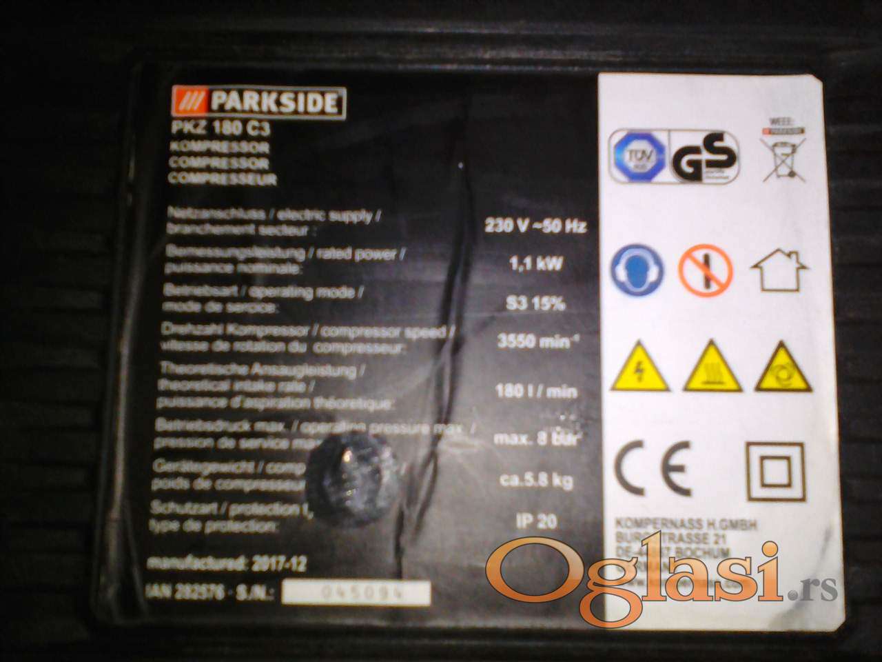 Prenosivi kompresor PARKSIDE PKZ 180 C3, kompletan sa svim dodacima, napajanje 220 V, snaga 1.1 KW, kapacitet 180 lit./min., maksimalni radni pritisak 8 bar, korišćen jednom ili dvaput, BEZ OŠTEĆENJA.