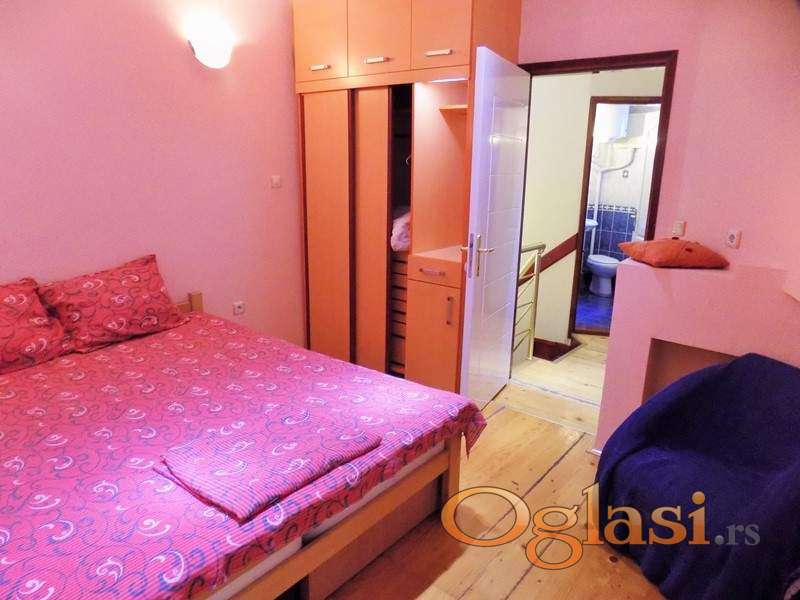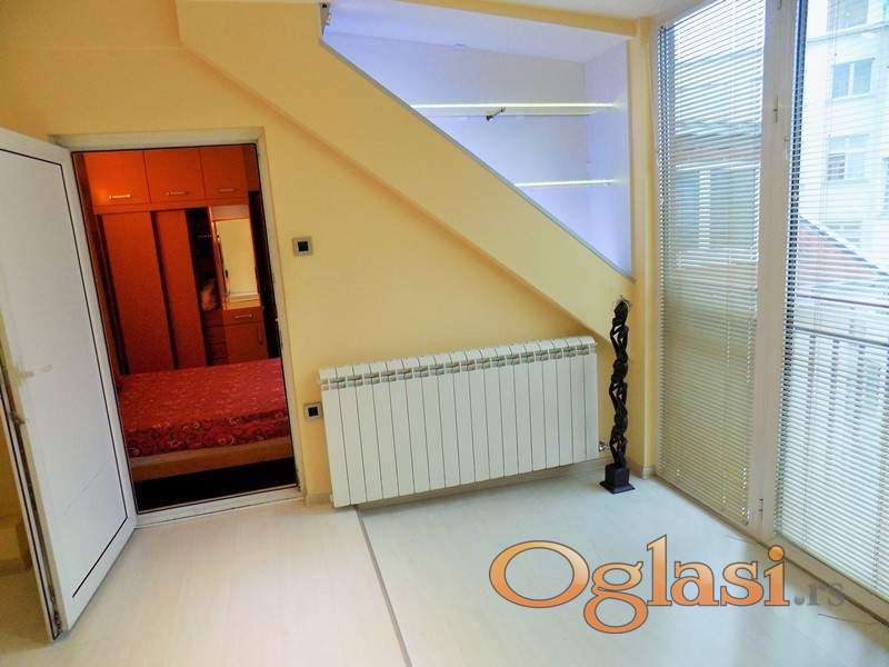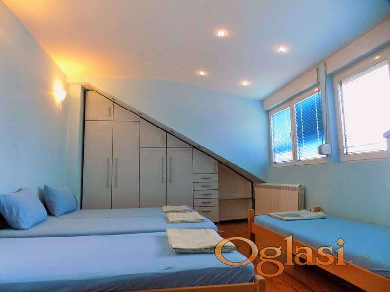 Prelep duplex sa dva kupatila, klimatizovan sa dve klime, kompletno namešten , CG, KATV, internet, ugrađeni plakari, tri spavaće sobe, osvetljen, miran, bez buke. Na prvom nivou je veliki dnevni boravak sa kuhinjsko-trpezarijskim delom u obliku ćiriličnog slova G i toalet, a na drugom nivou 3 spavaće sobe i još jedno kupatilo.