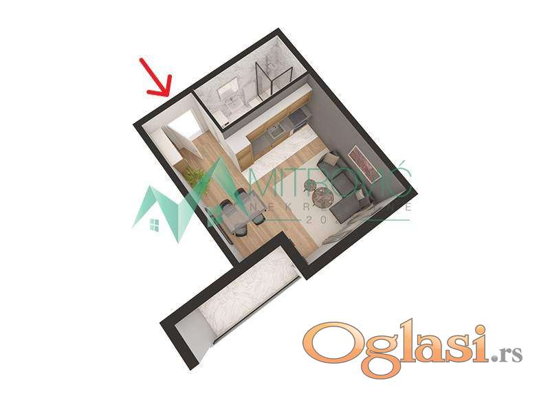 Struktura: Garsonjera (ulazni hodnik, kupatilo, prostrana dnevna soba sa kuhinjskim delom i terasa).