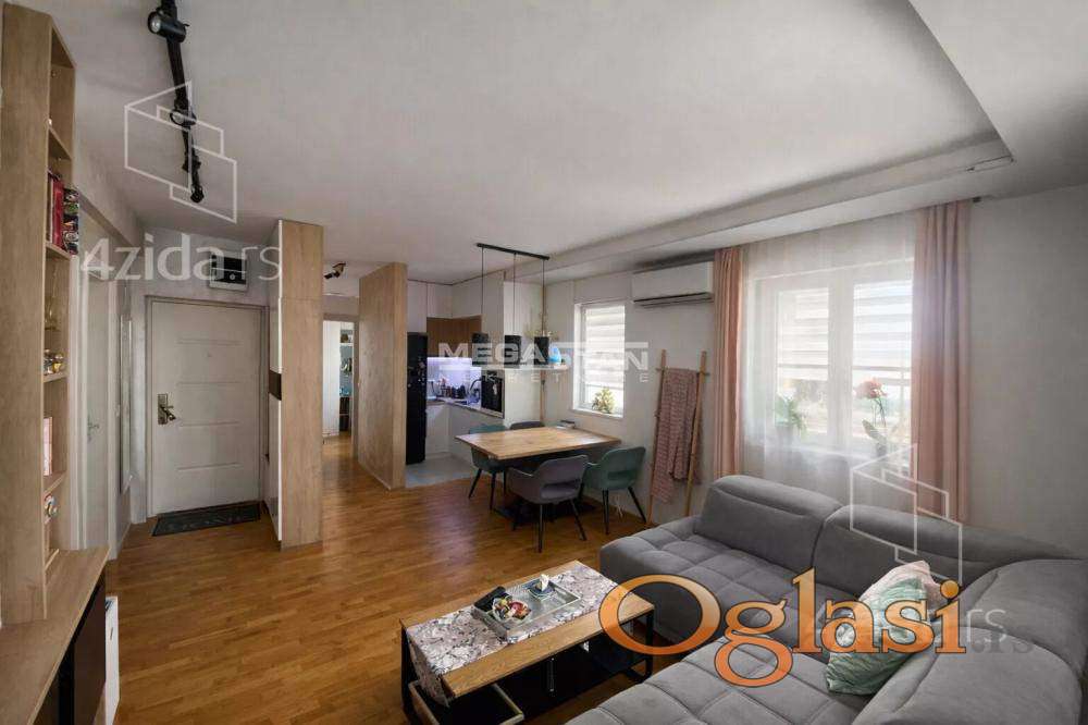 Struktura stana je sledeća: ulazni hodnik, dnevna soba sa kuhinjom i trpezarijskim delom, dve spavaće sobe i kupatilo.