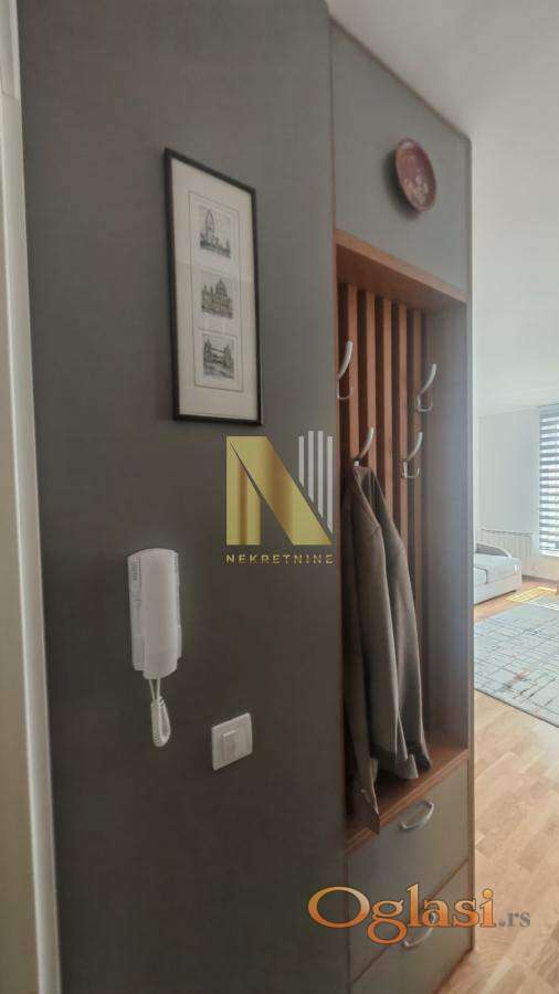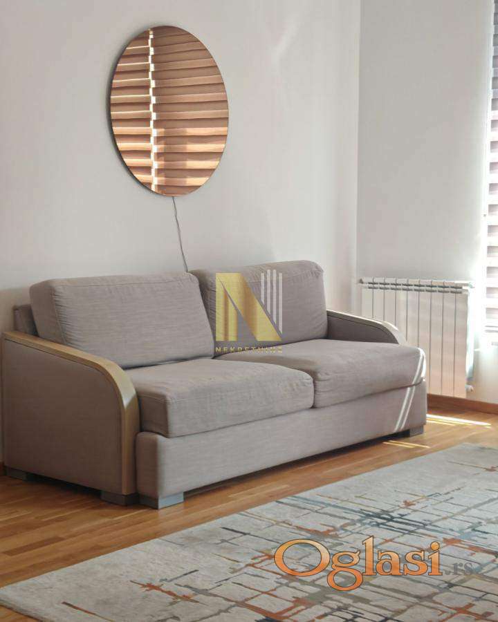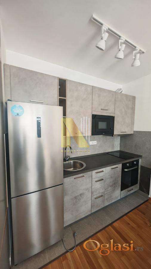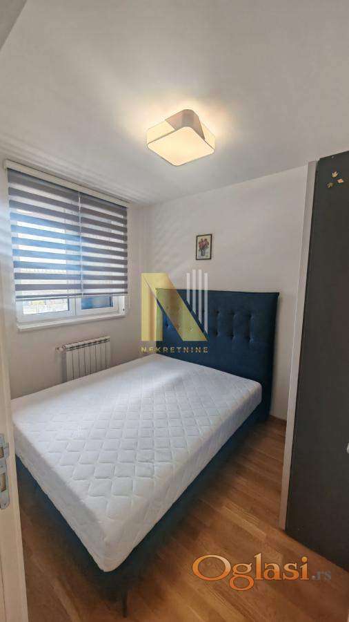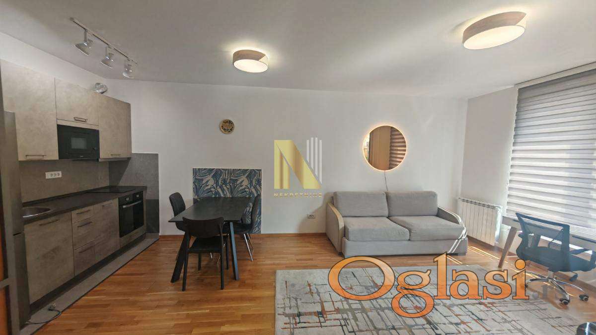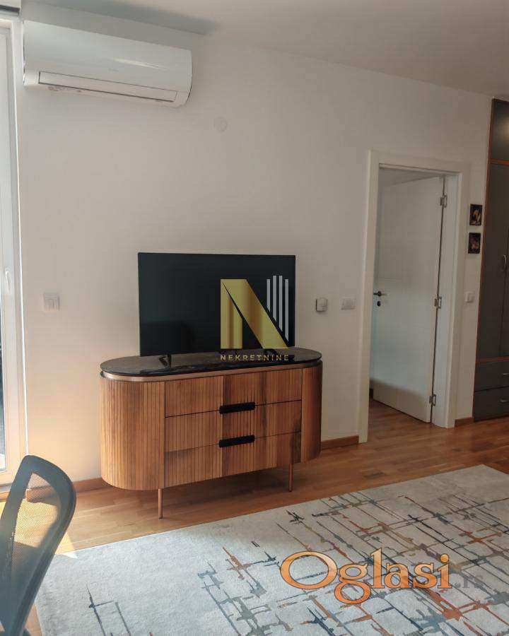 Izdaje se kompletno namešten jednoiposoban stan površine 43m2 u novijoj zgradi (staroj godinu dana), na odličnoj lokaciji kod Sajma, u непосредној blizini IQ biznis centra.
